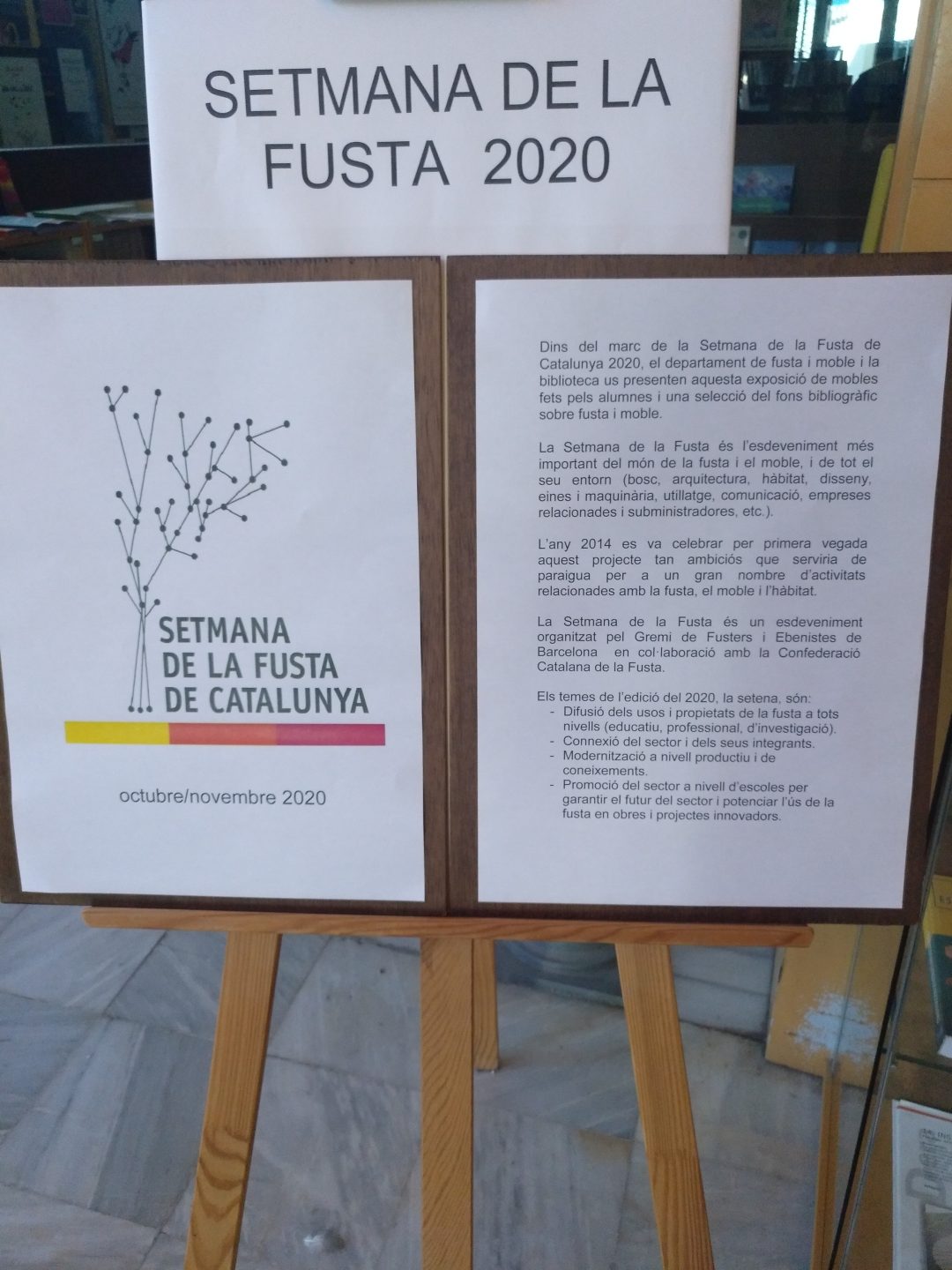 Dins del marc de la Setmana de la Fusta de Catalunya 2020, el departament de fusta i moble i la biblioteca us presentem una exposició de mobles fets pels alumnes i una selecció del fons bibliogràfic sobre fusta i moble.