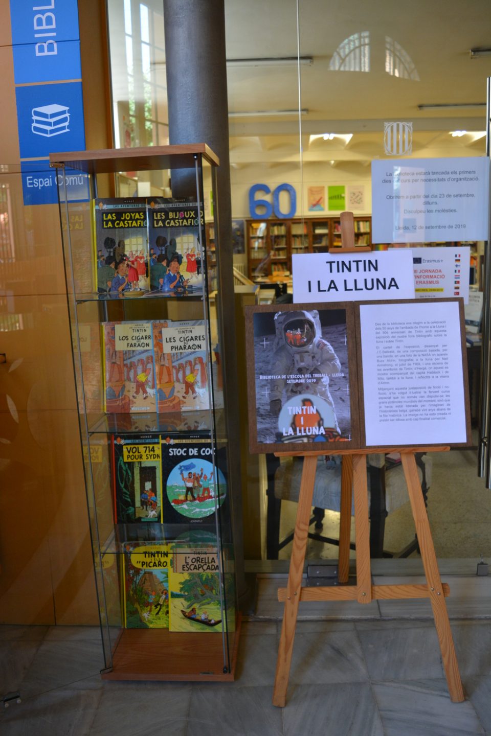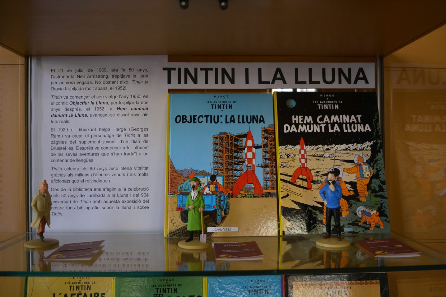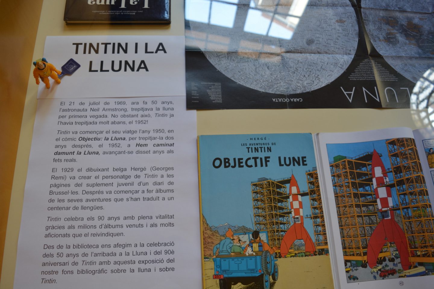 Des de la biblioteca ens hem afegit a la celebració dels 50 anys de l’arribada a la Lluna i del 90è aniversari de Tintin amb una exposició del nostre fons bibliogràfic sobre la lluna i sobre Tintin.