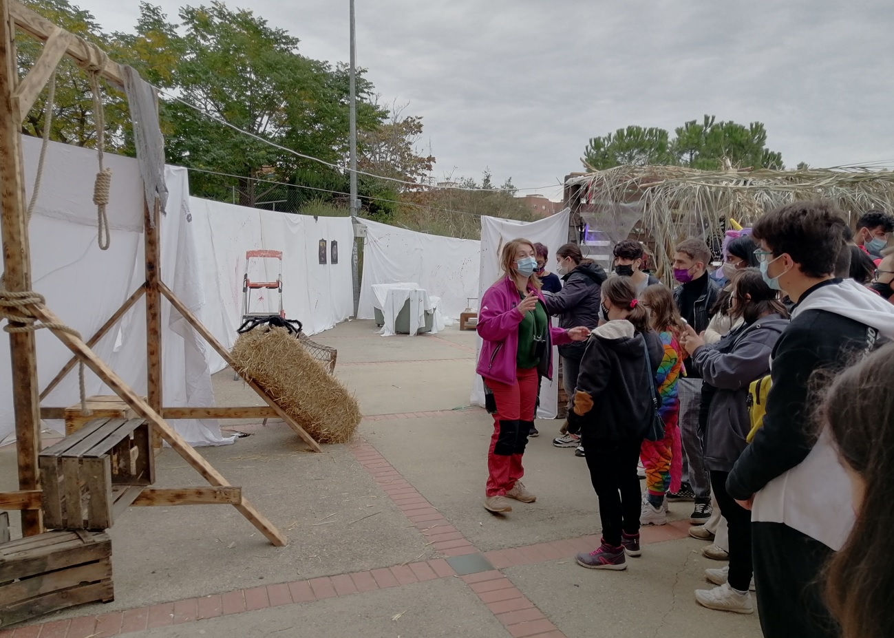 L’espai estava ambientat i decorat amb motius de Halloween i Castanyada ideats i realitzats per l’alumnat: garlandes de fantasmes, globus monstruosos, teranyines gegants, pots de vidre- mòmia i espais de decoració clàssica de Castanyada amb fulles, troncs i ninos i caragols fets amb castanyes.
