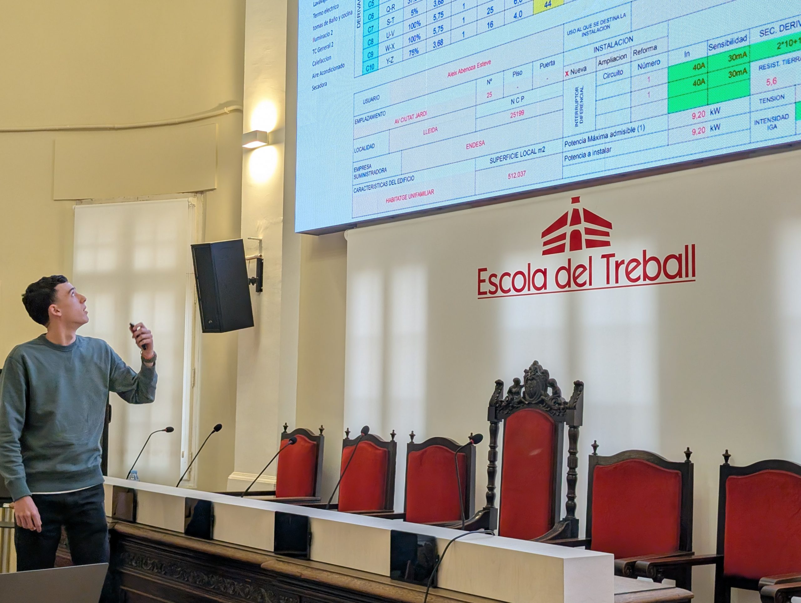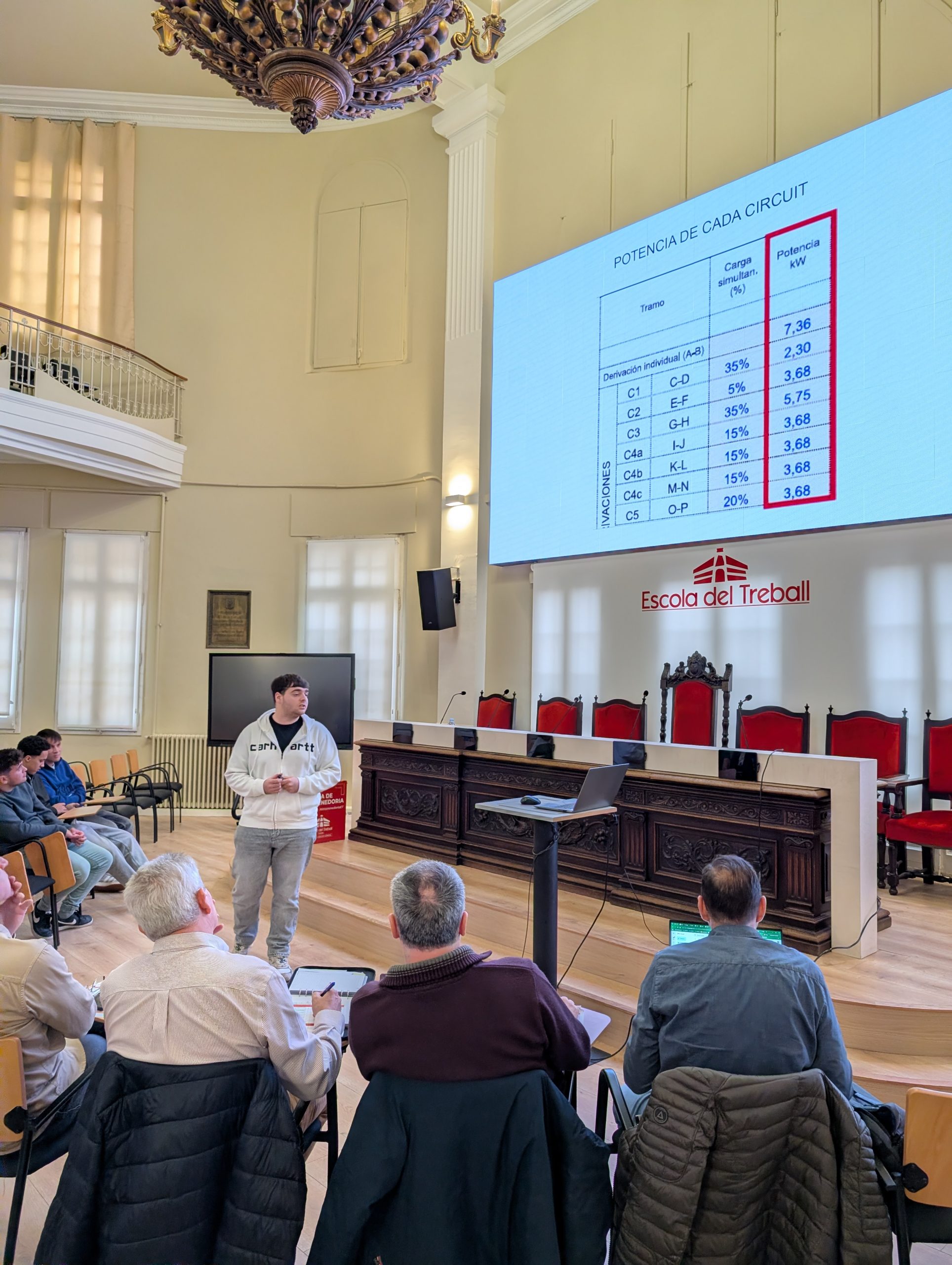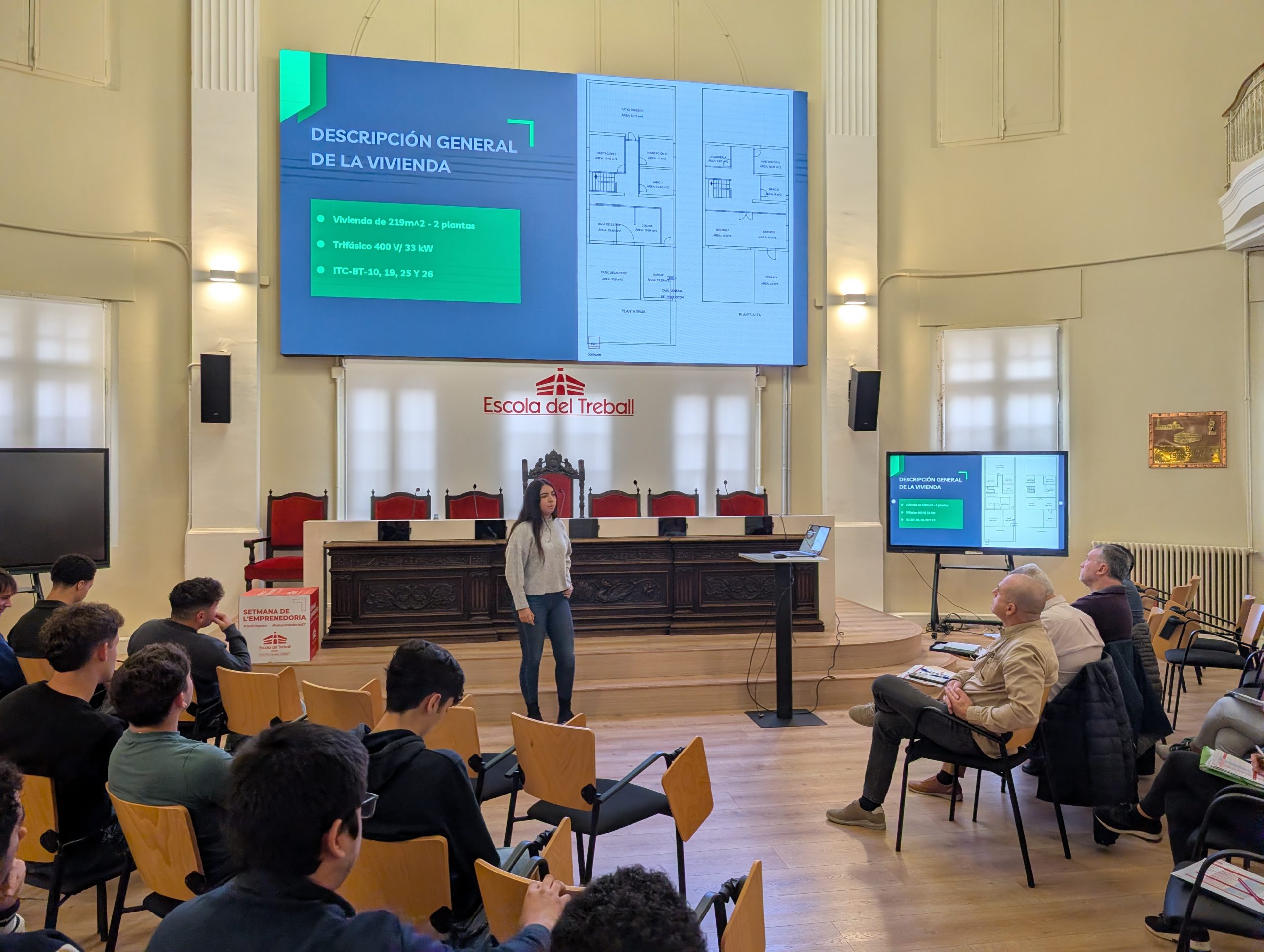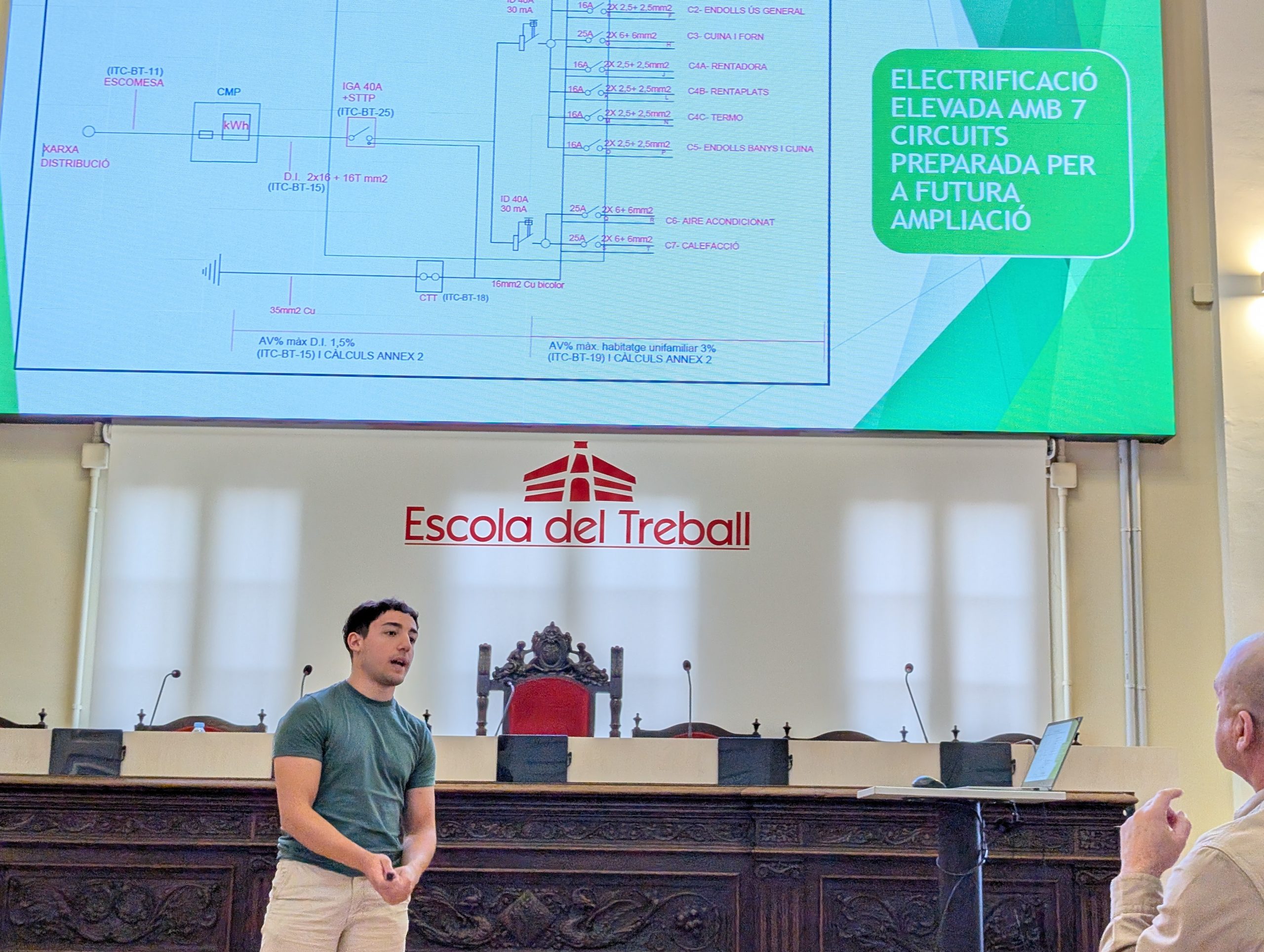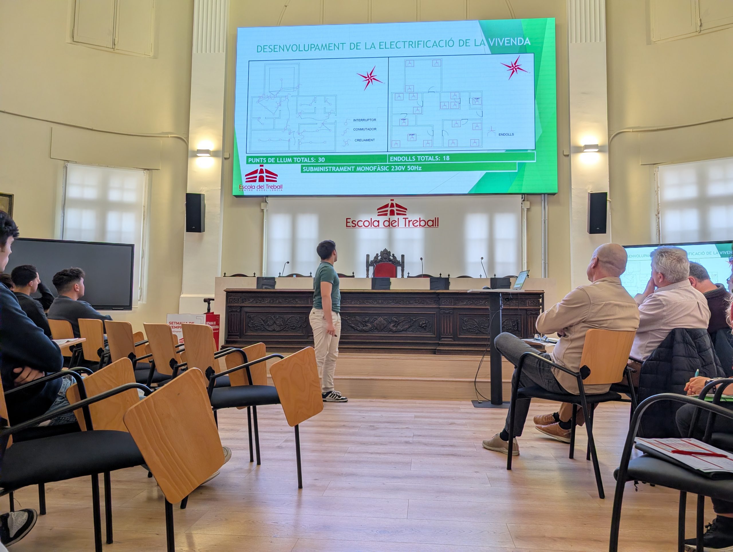 L’alumnat de primer curs del cicle formatiu de grau superior d’Energies Renovables de l’Escola del Treball de Lleida ha presentat recentment el Projecte 1: Electrificació d’un habitatge, en un acte celebrat a la històrica Sala d’Actes del centre. L’esdeveniment ha comptat amb l’assistència de l’equip docent del cicle i amb la presència destacada de professionals referents del sector elèctric, que han valorat i orientat els projectes des de la seva experiència.