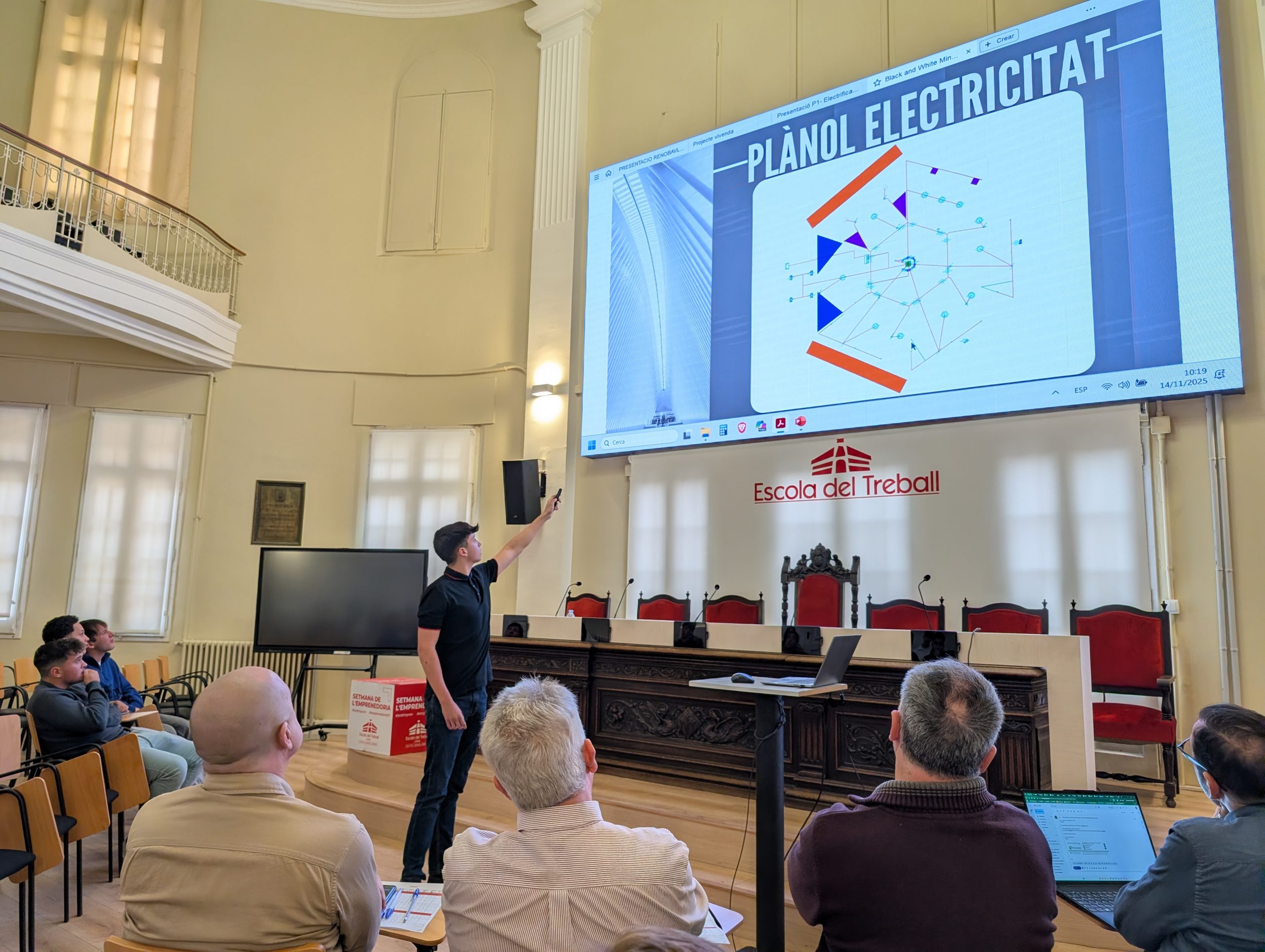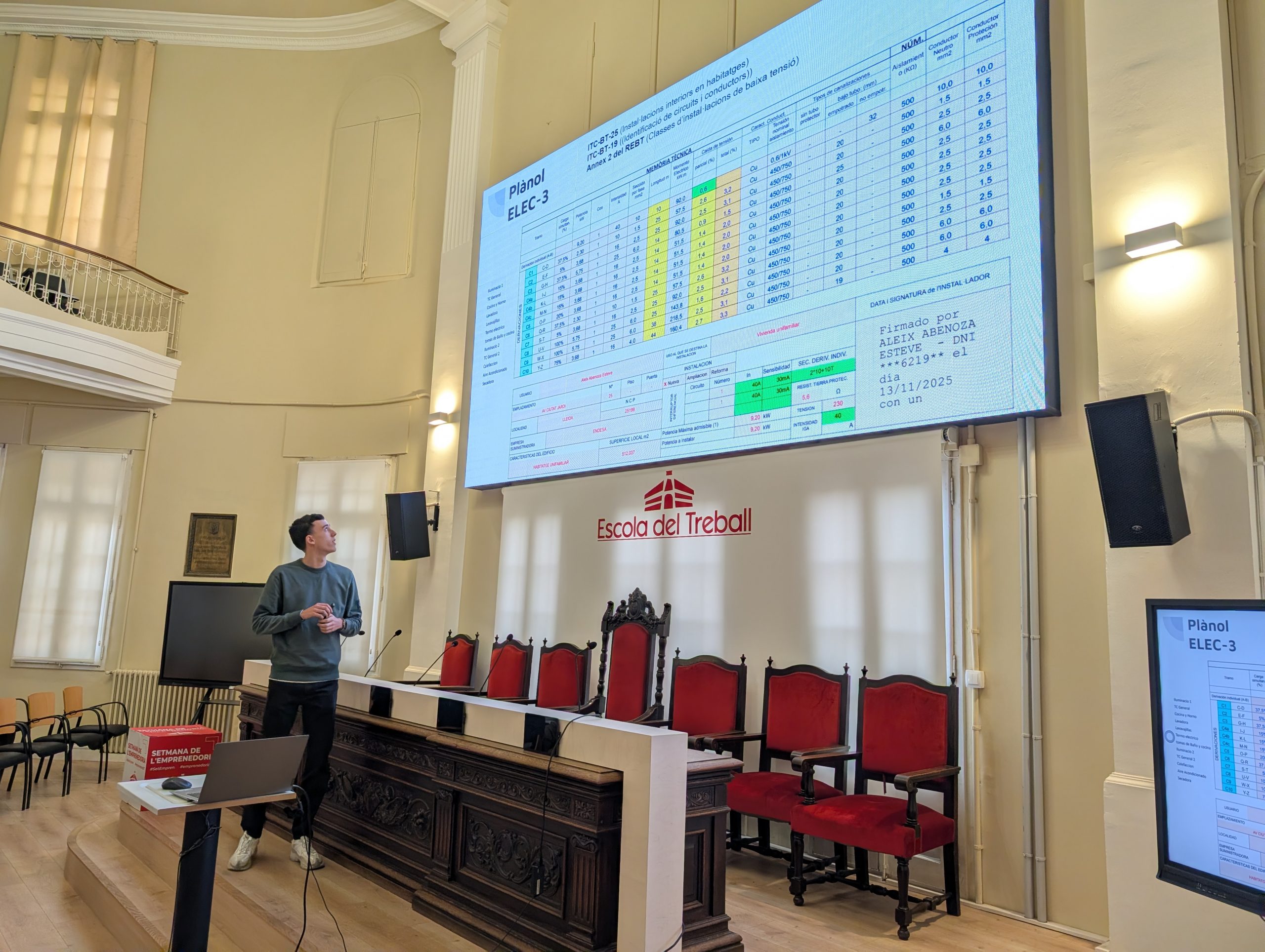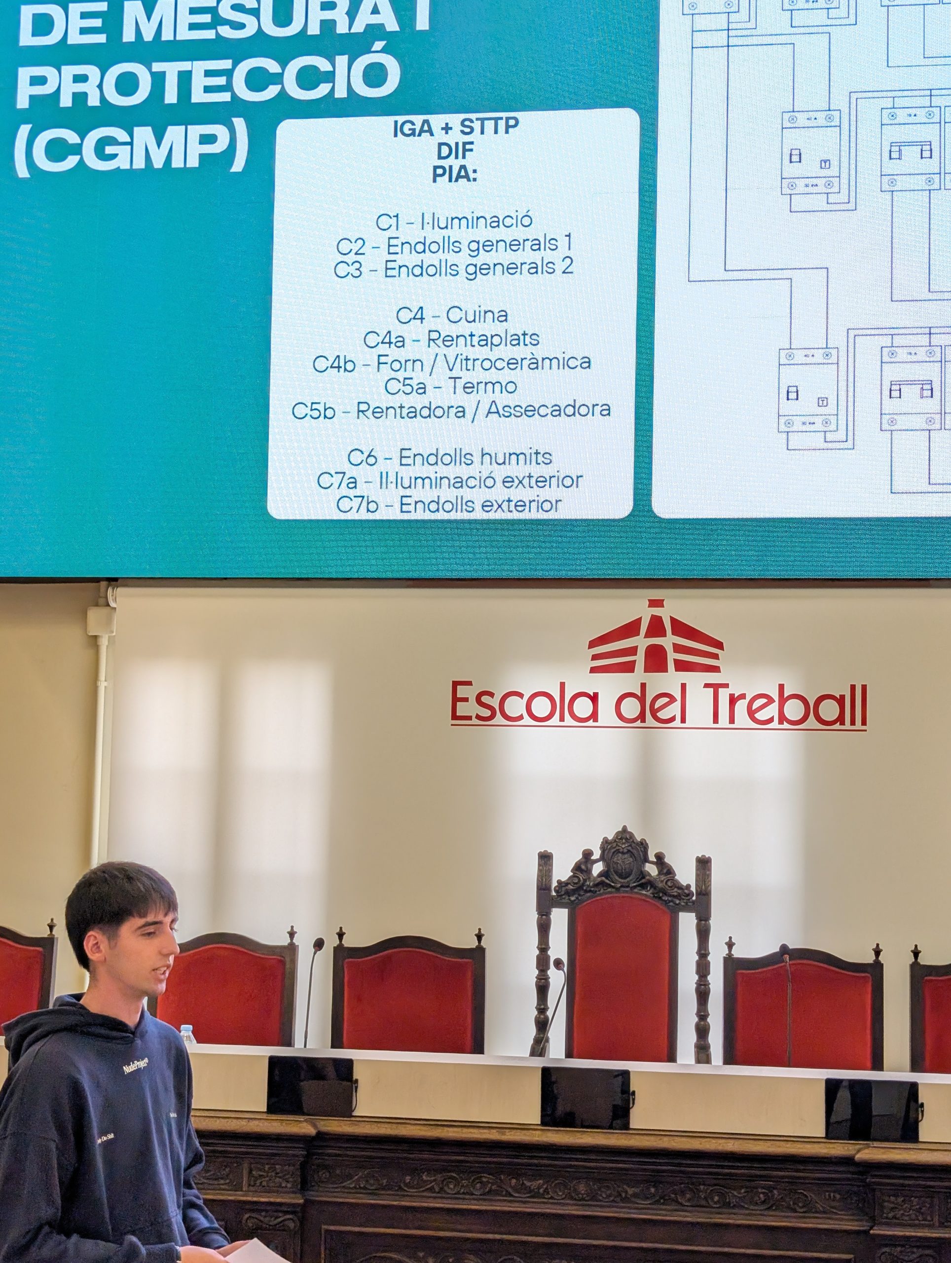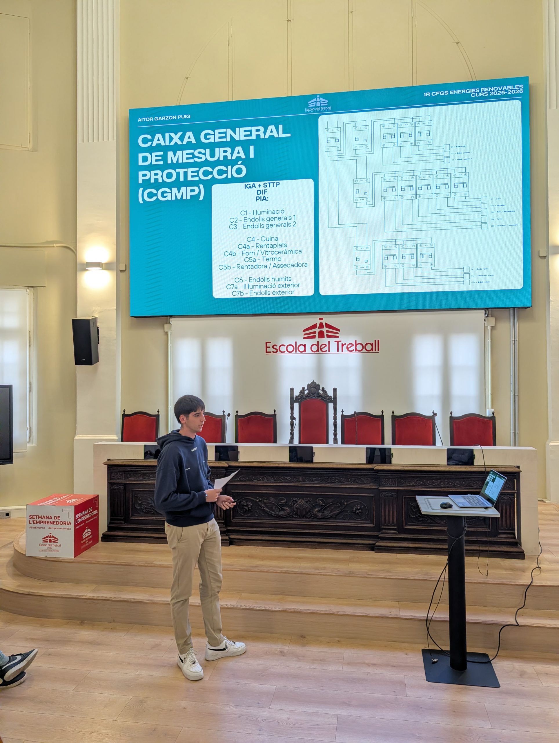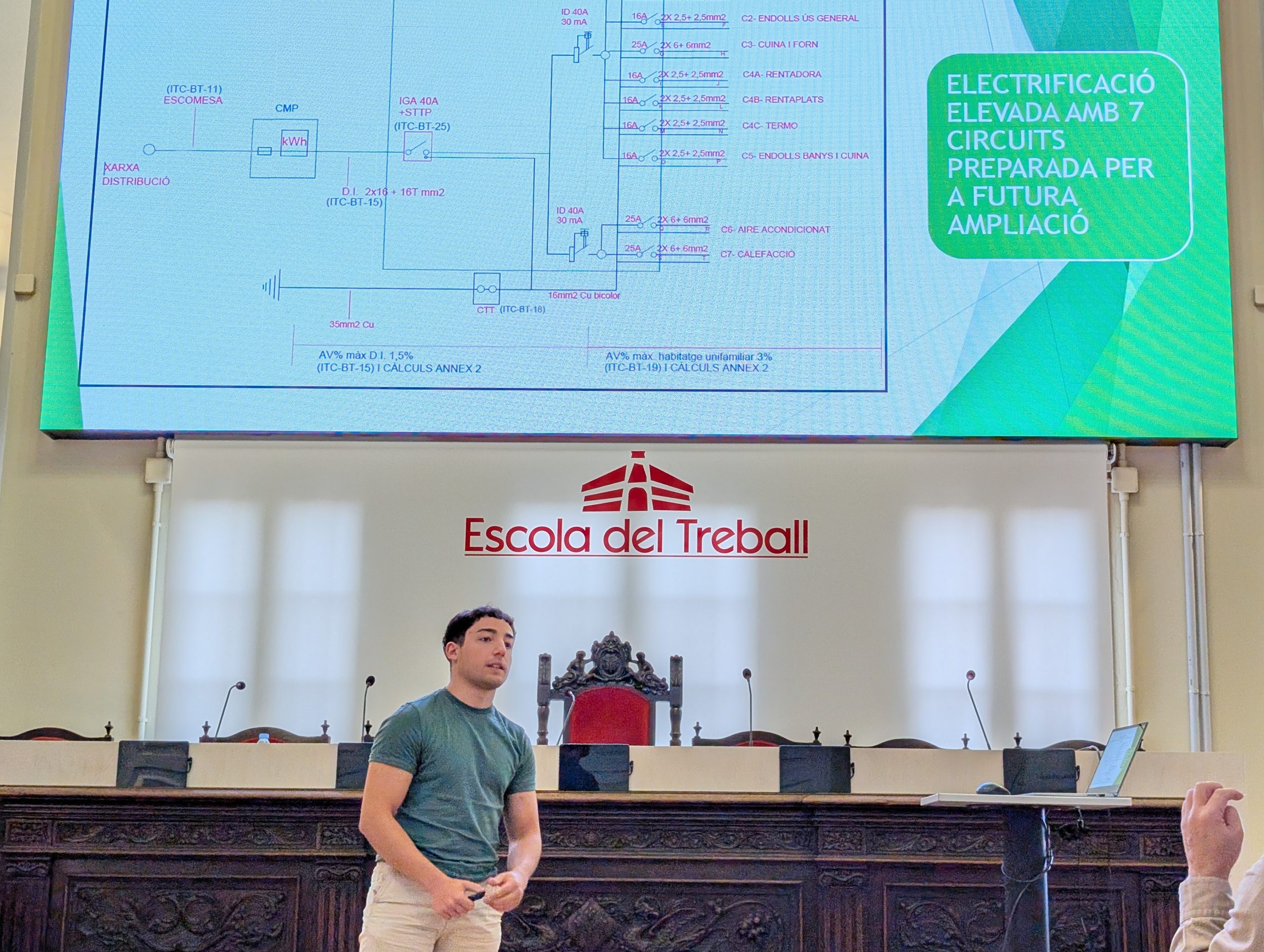 L’alumnat de primer curs del cicle formatiu de grau superior d’Energies Renovables de l’Escola del Treball de Lleida ha presentat recentment el Projecte 1: Electrificació d’un habitatge, en un acte celebrat a la històrica Sala d’Actes del centre. L’esdeveniment ha comptat amb l’assistència de l’equip docent del cicle i amb la presència destacada de professionals referents del sector elèctric, que han valorat i orientat els projectes des de la seva experiència.