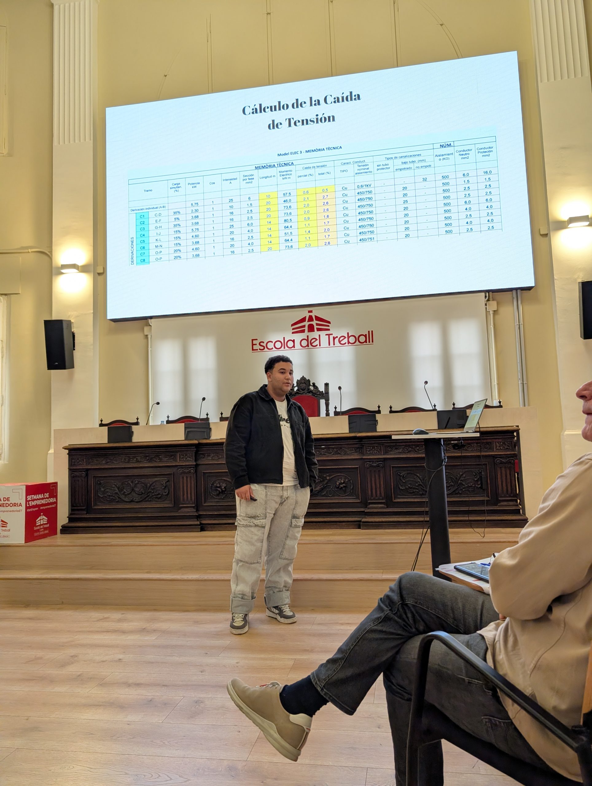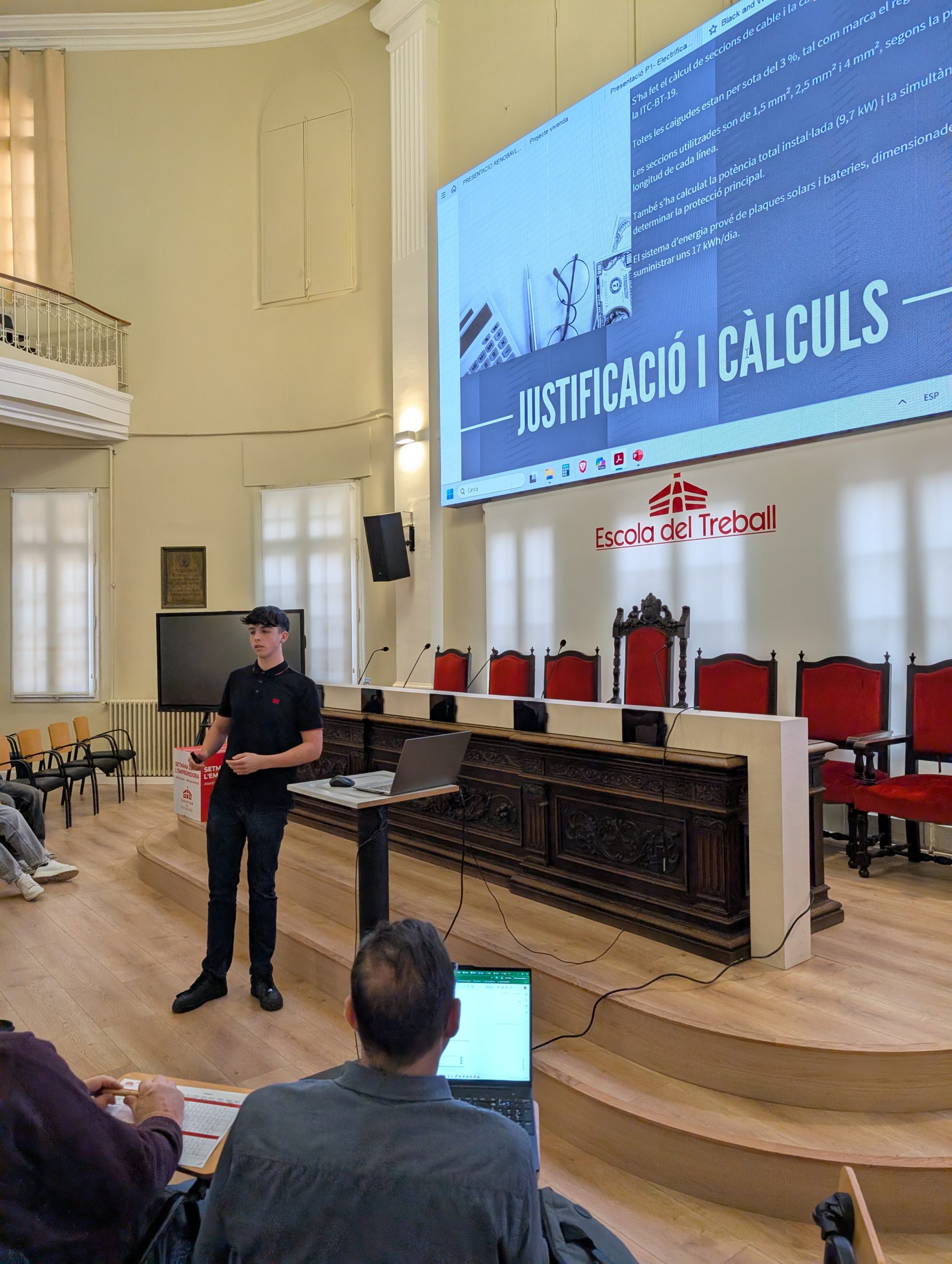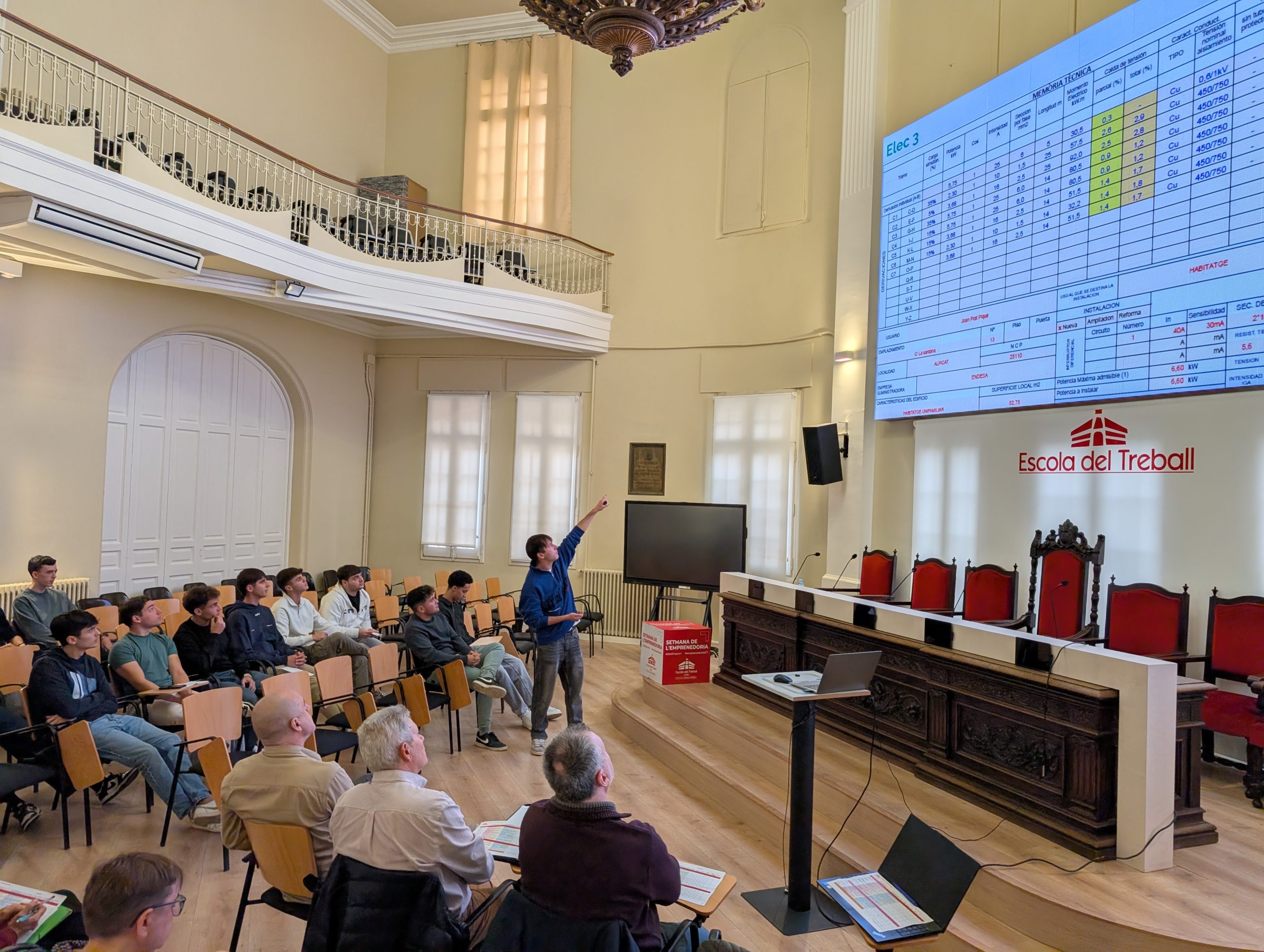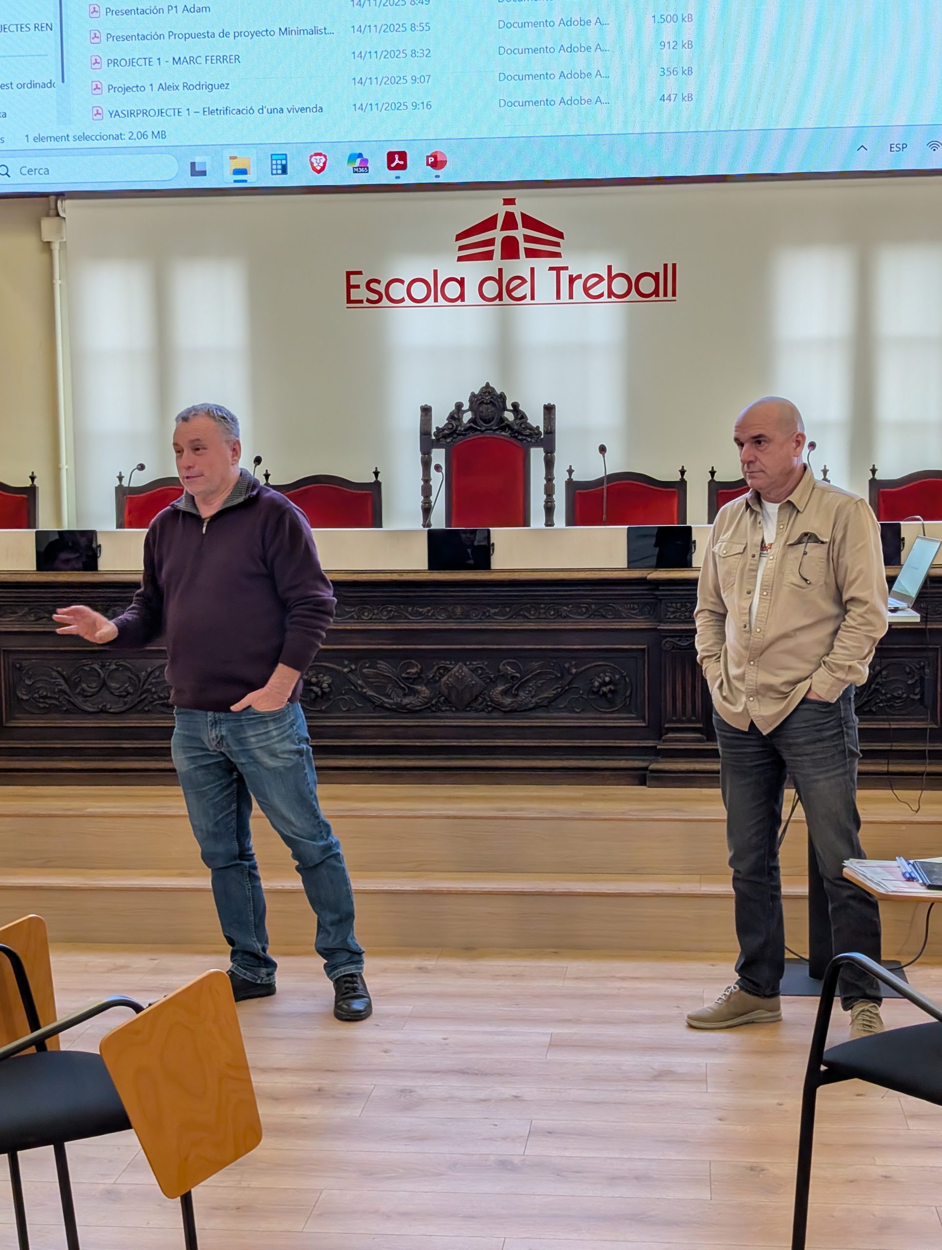 L’alumnat de primer curs del cicle formatiu de grau superior d’Energies Renovables de l’Escola del Treball de Lleida ha presentat recentment el Projecte 1: Electrificació d’un habitatge, en un acte celebrat a la històrica Sala d’Actes del centre. L’esdeveniment ha comptat amb l’assistència de l’equip docent del cicle i amb la presència destacada de professionals referents del sector elèctric, que han valorat i orientat els projectes des de la seva experiència.