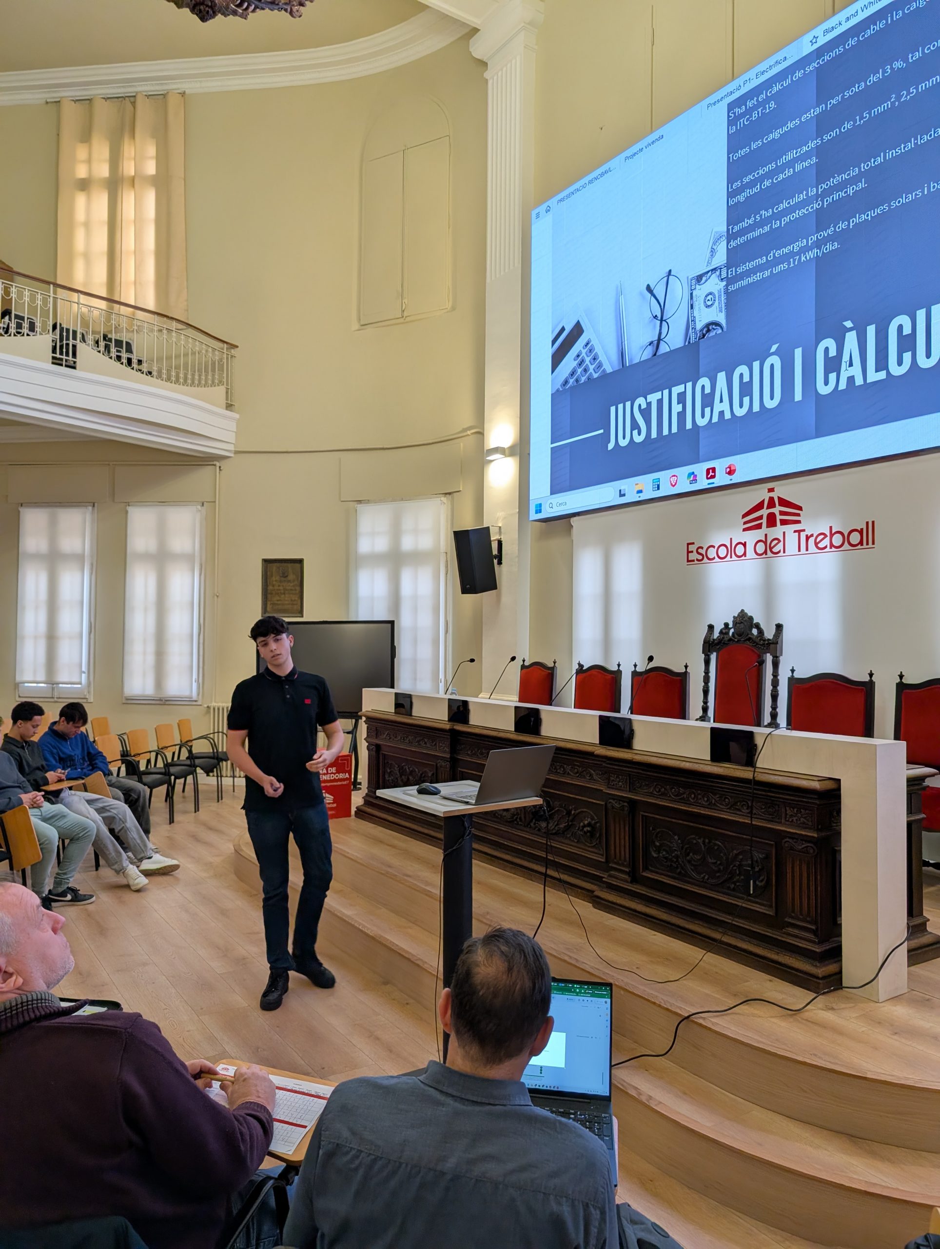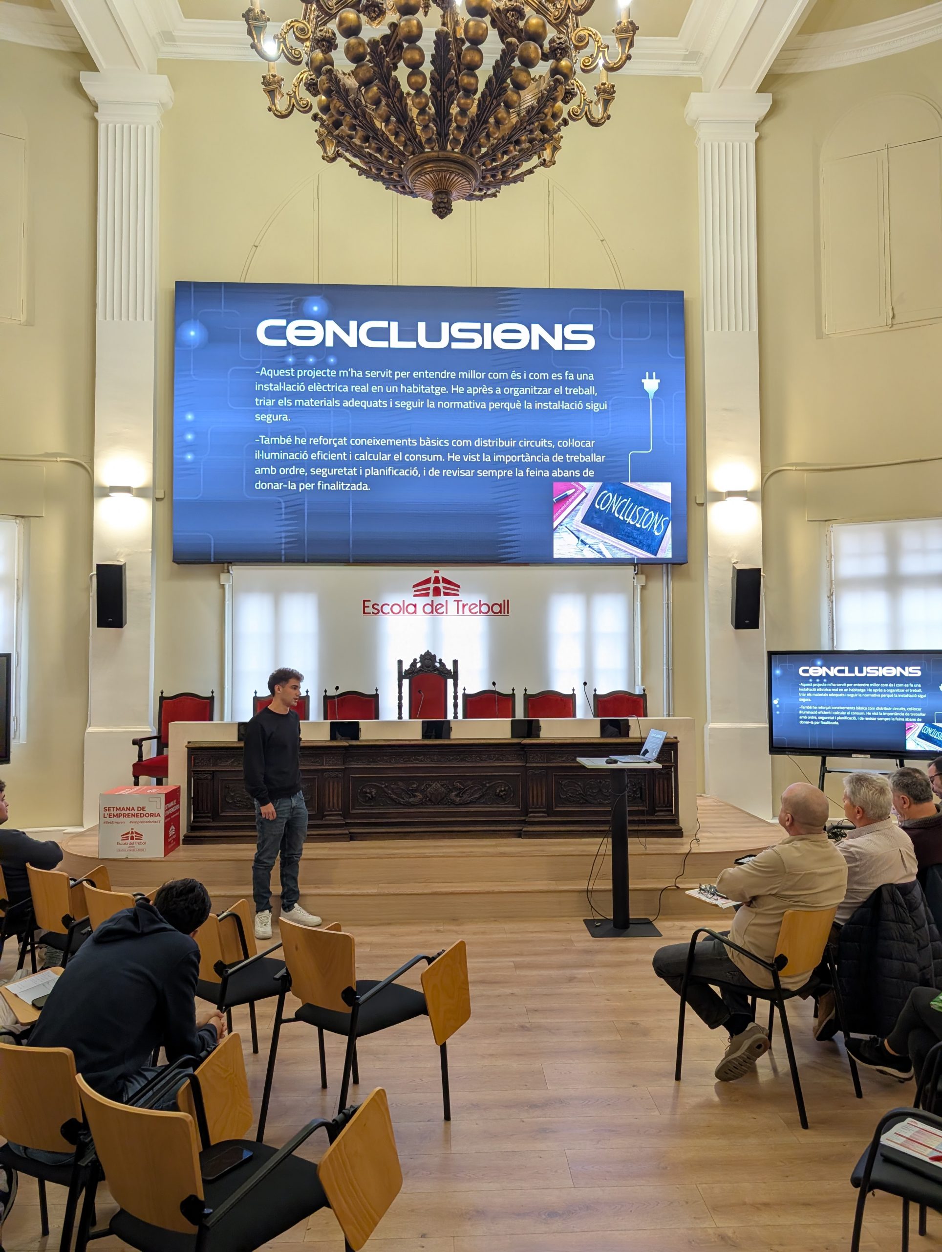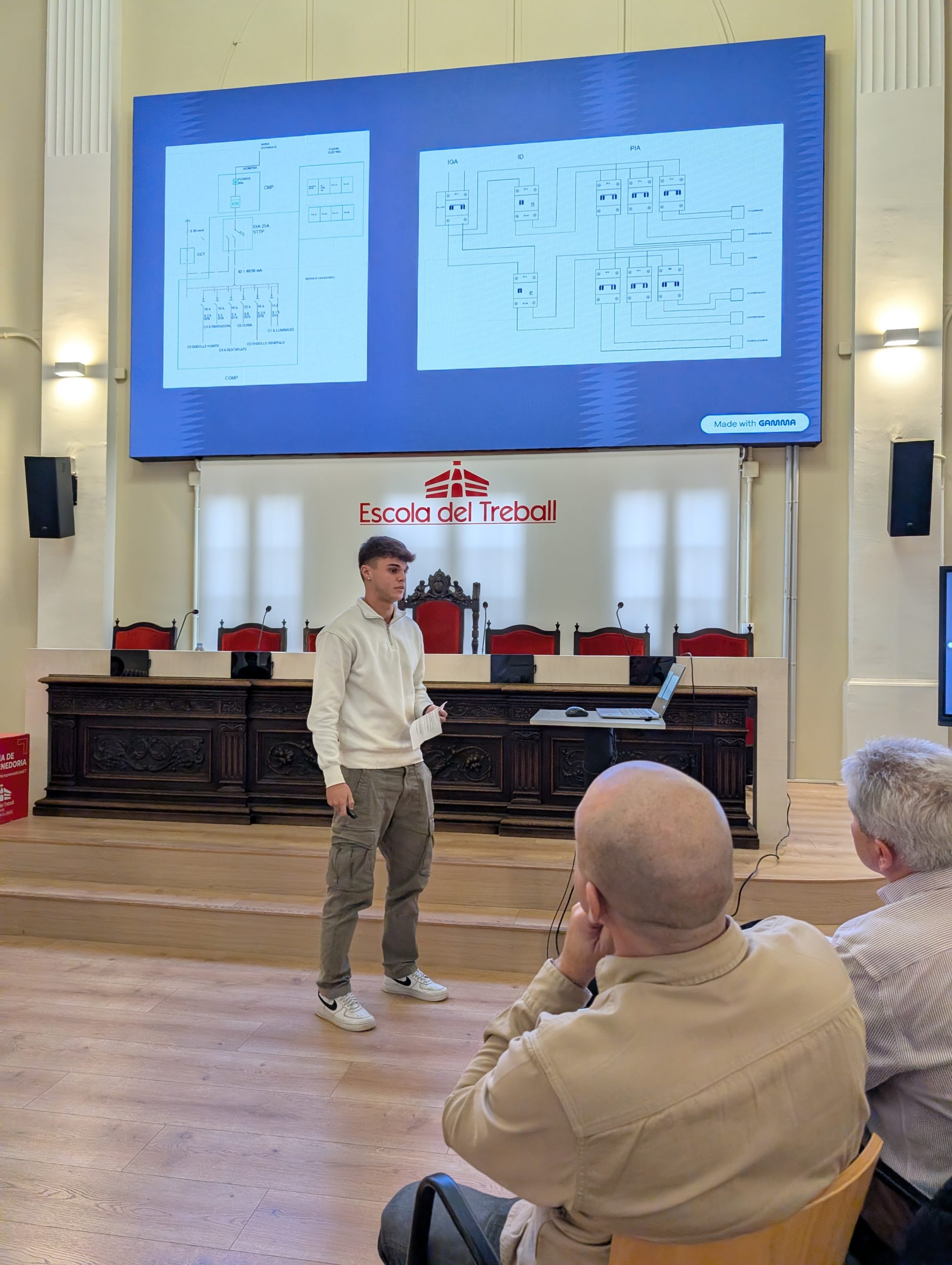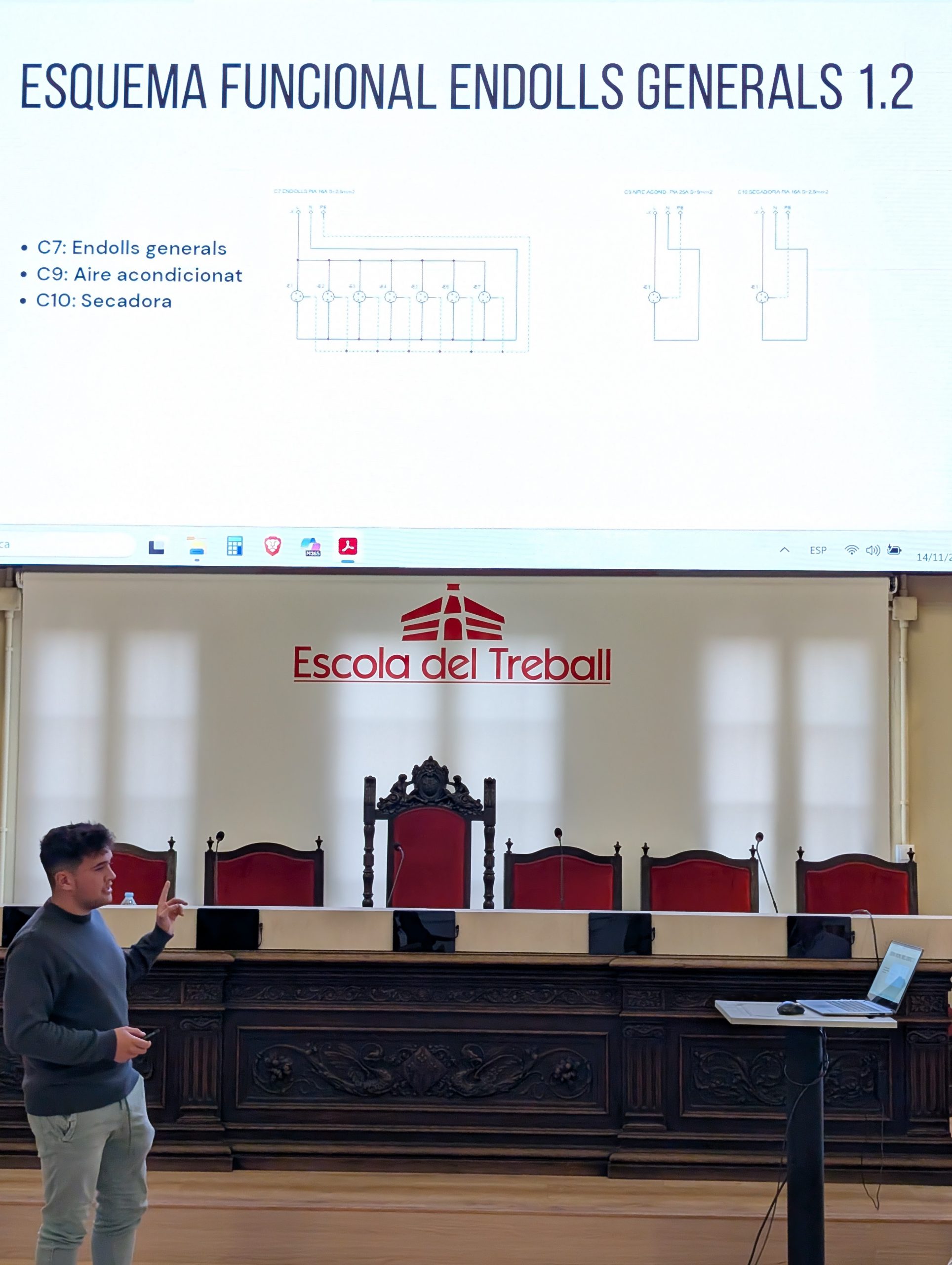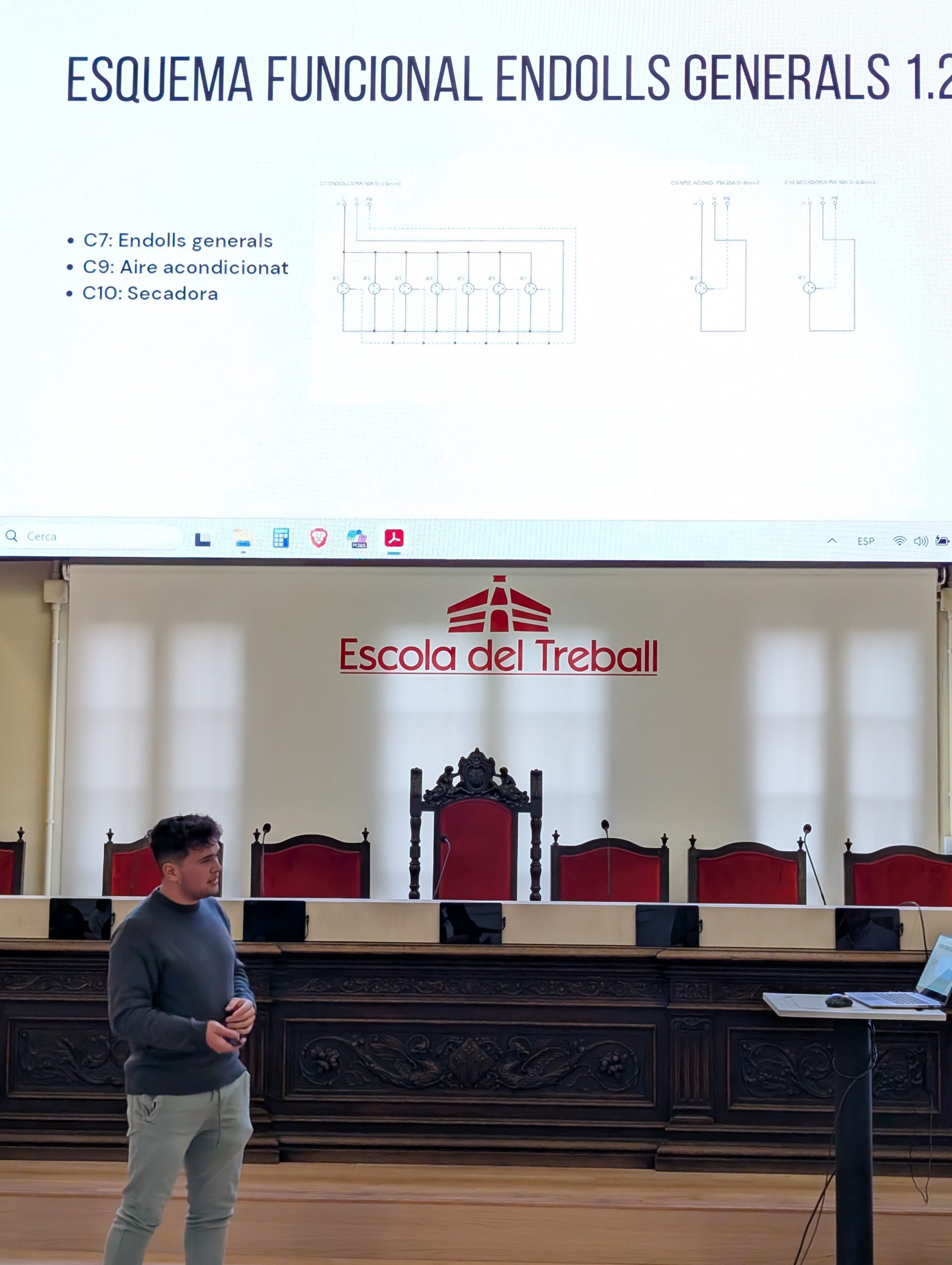 L’alumnat de primer curs del cicle formatiu de grau superior d’Energies Renovables de l’Escola del Treball de Lleida ha presentat recentment el Projecte 1: Electrificació d’un habitatge, en un acte celebrat a la històrica Sala d’Actes del centre. L’esdeveniment ha comptat amb l’assistència de l’equip docent del cicle i amb la presència destacada de professionals referents del sector elèctric, que han valorat i orientat els projectes des de la seva experiència.