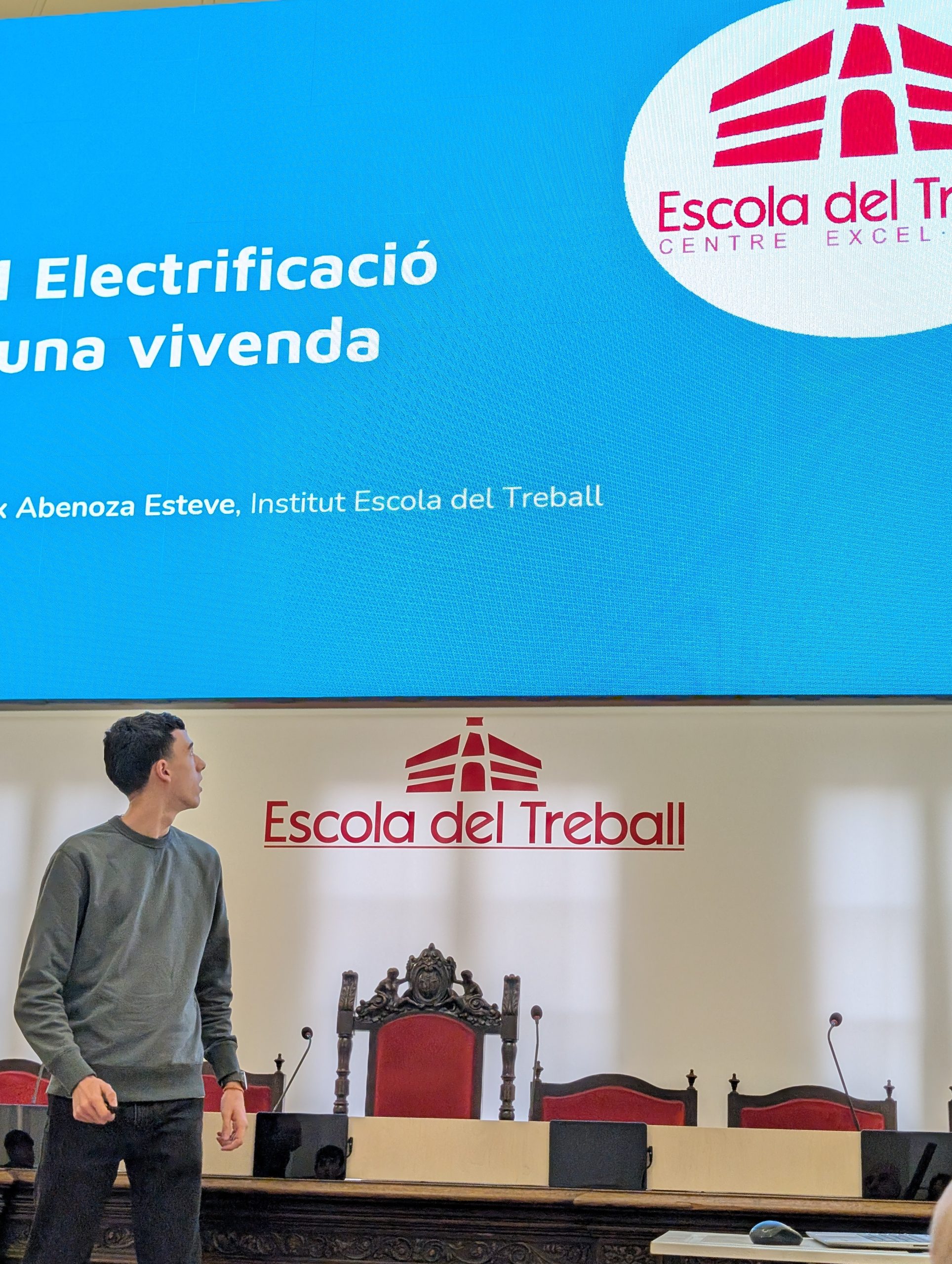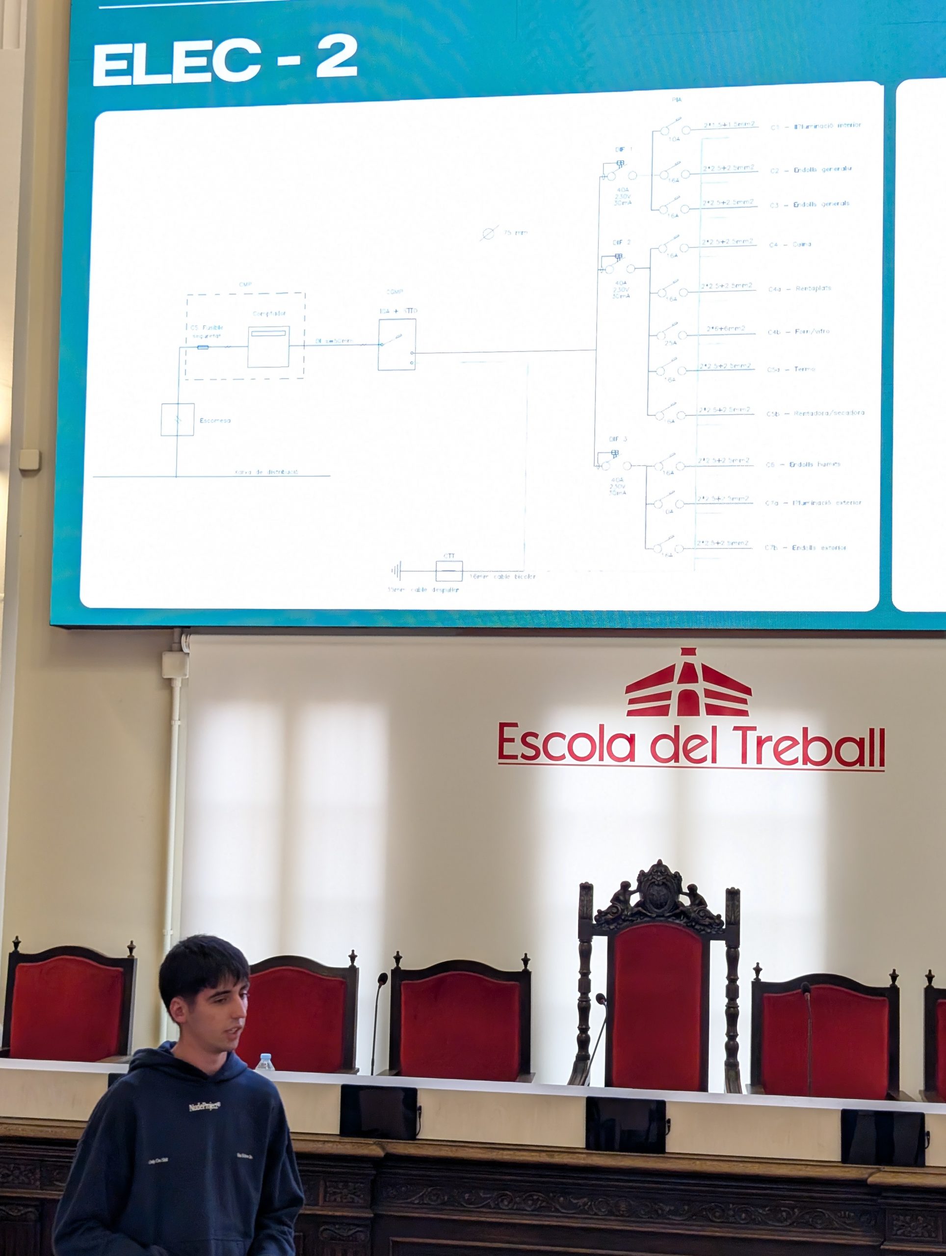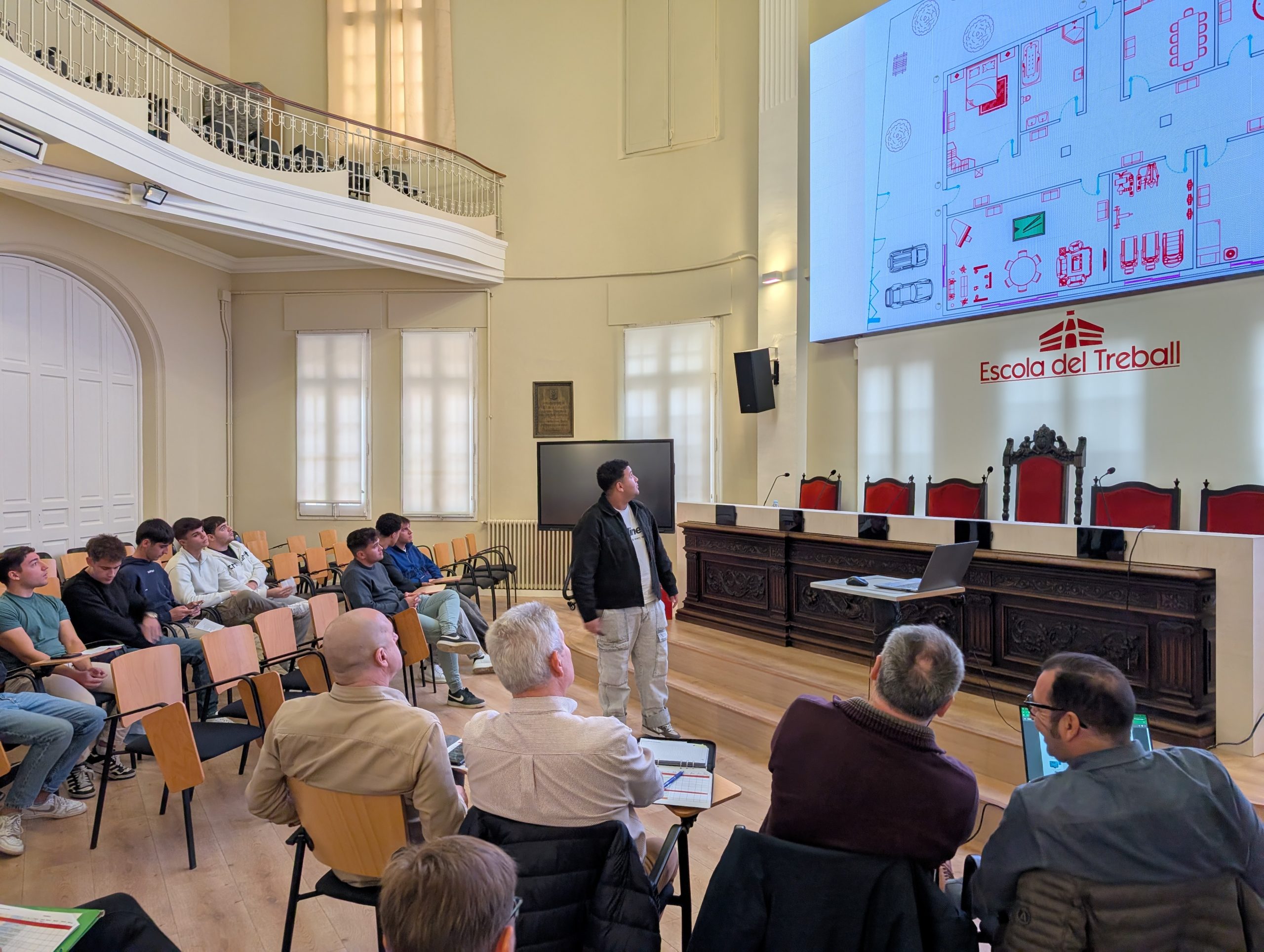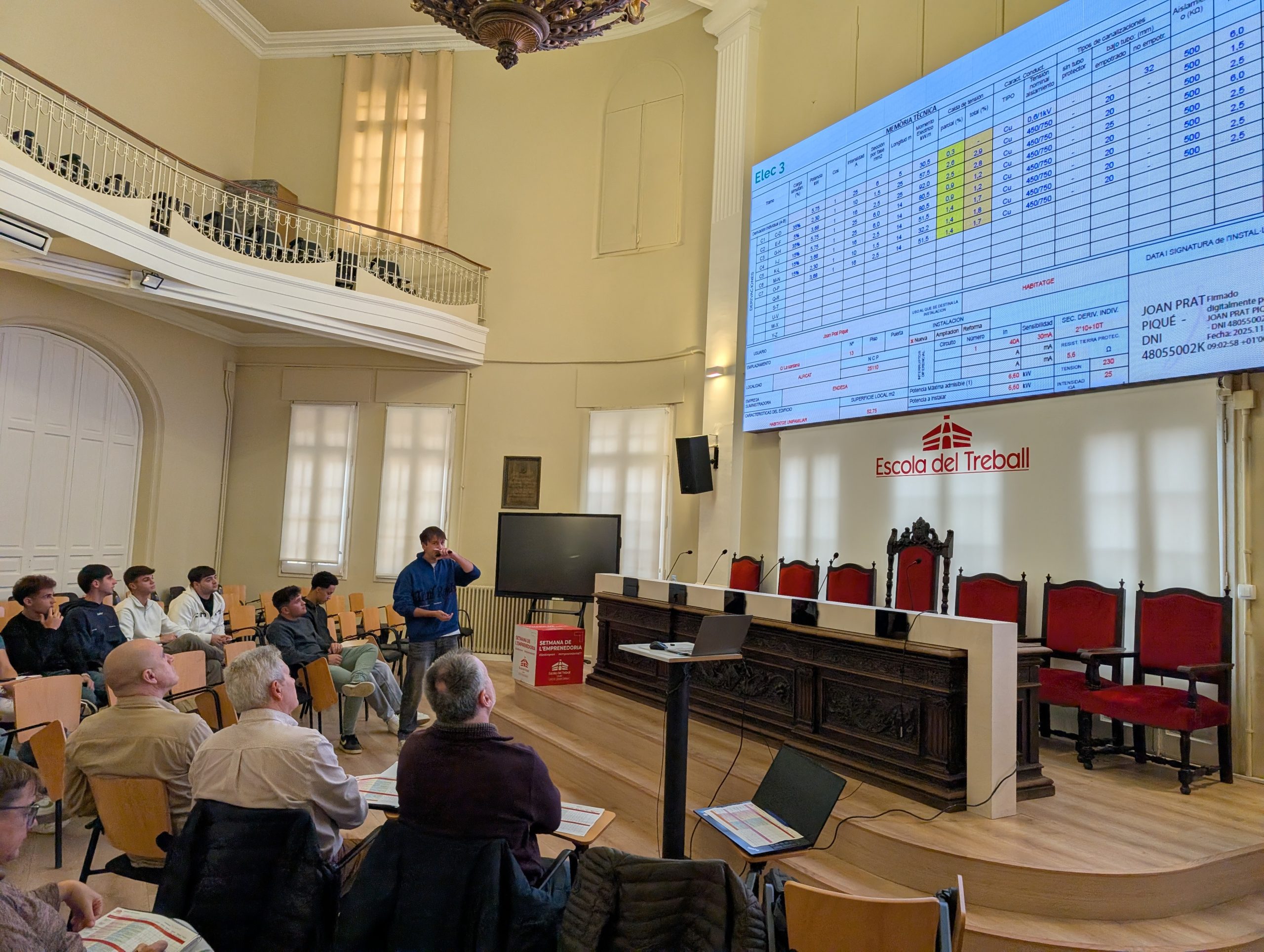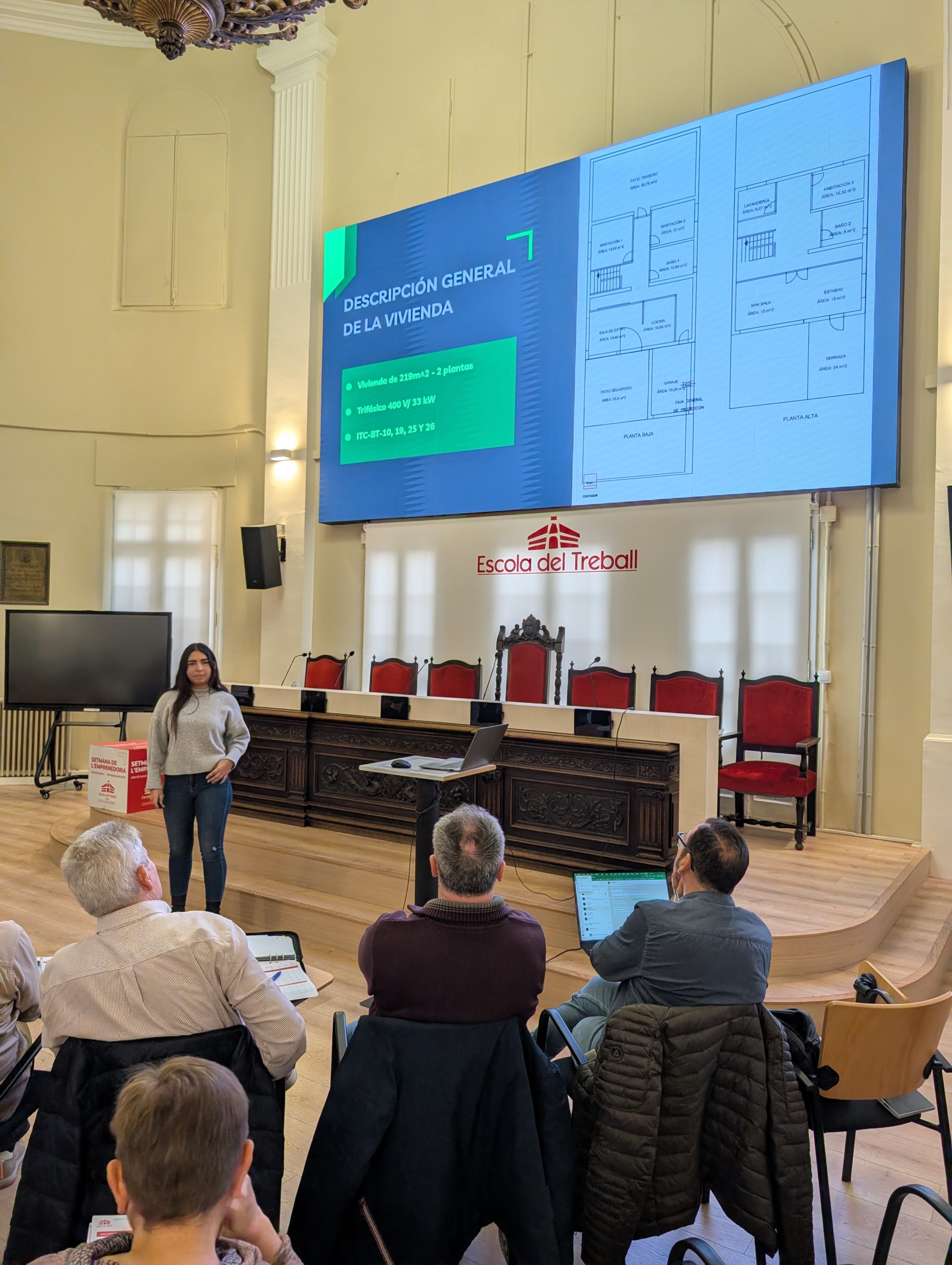 L’alumnat de primer curs del cicle formatiu de grau superior d’Energies Renovables de l’Escola del Treball de Lleida ha presentat recentment el Projecte 1: Electrificació d’un habitatge, en un acte celebrat a la històrica Sala d’Actes del centre. L’esdeveniment ha comptat amb l’assistència de l’equip docent del cicle i amb la presència destacada de professionals referents del sector elèctric, que han valorat i orientat els projectes des de la seva experiència.