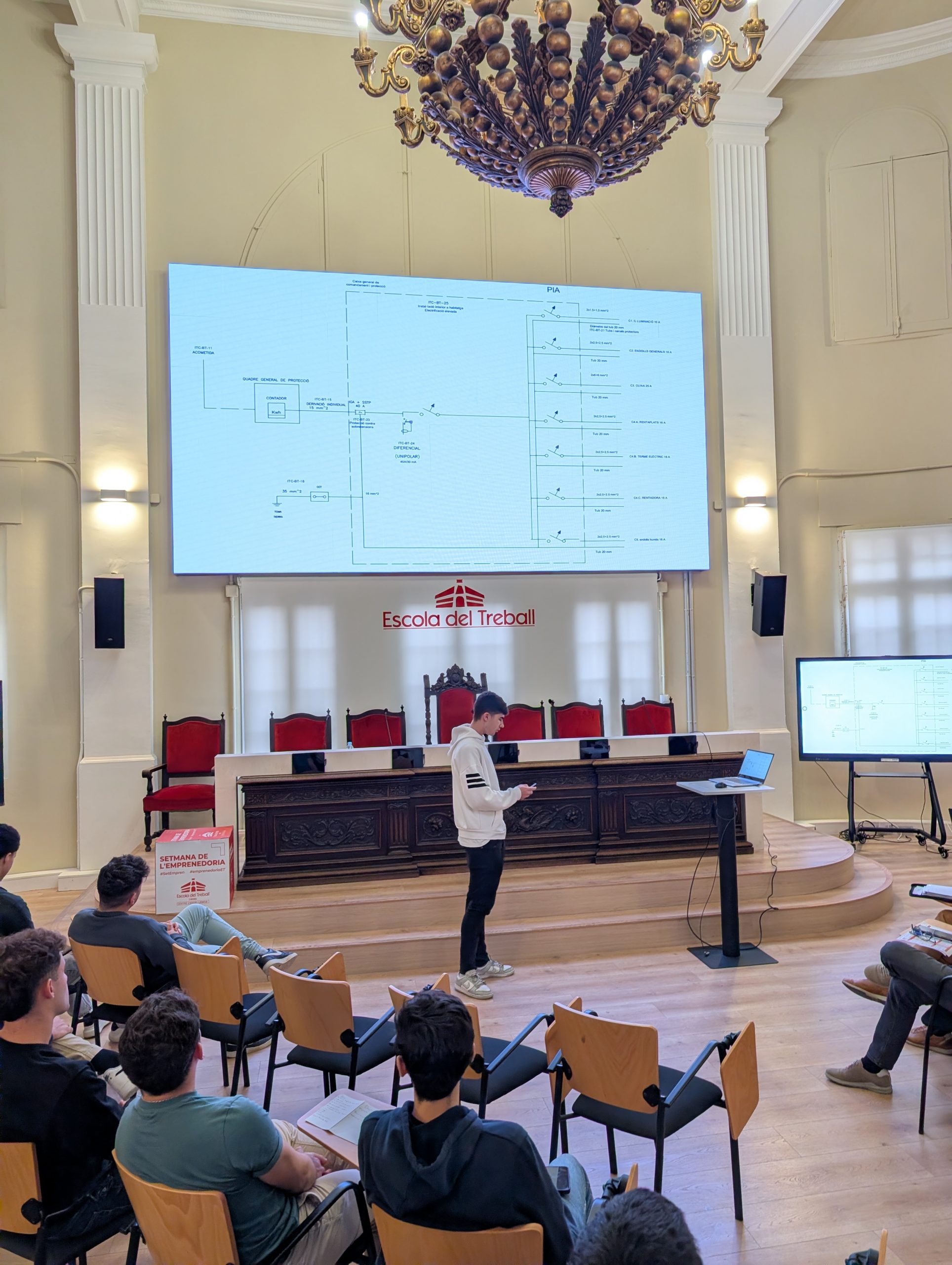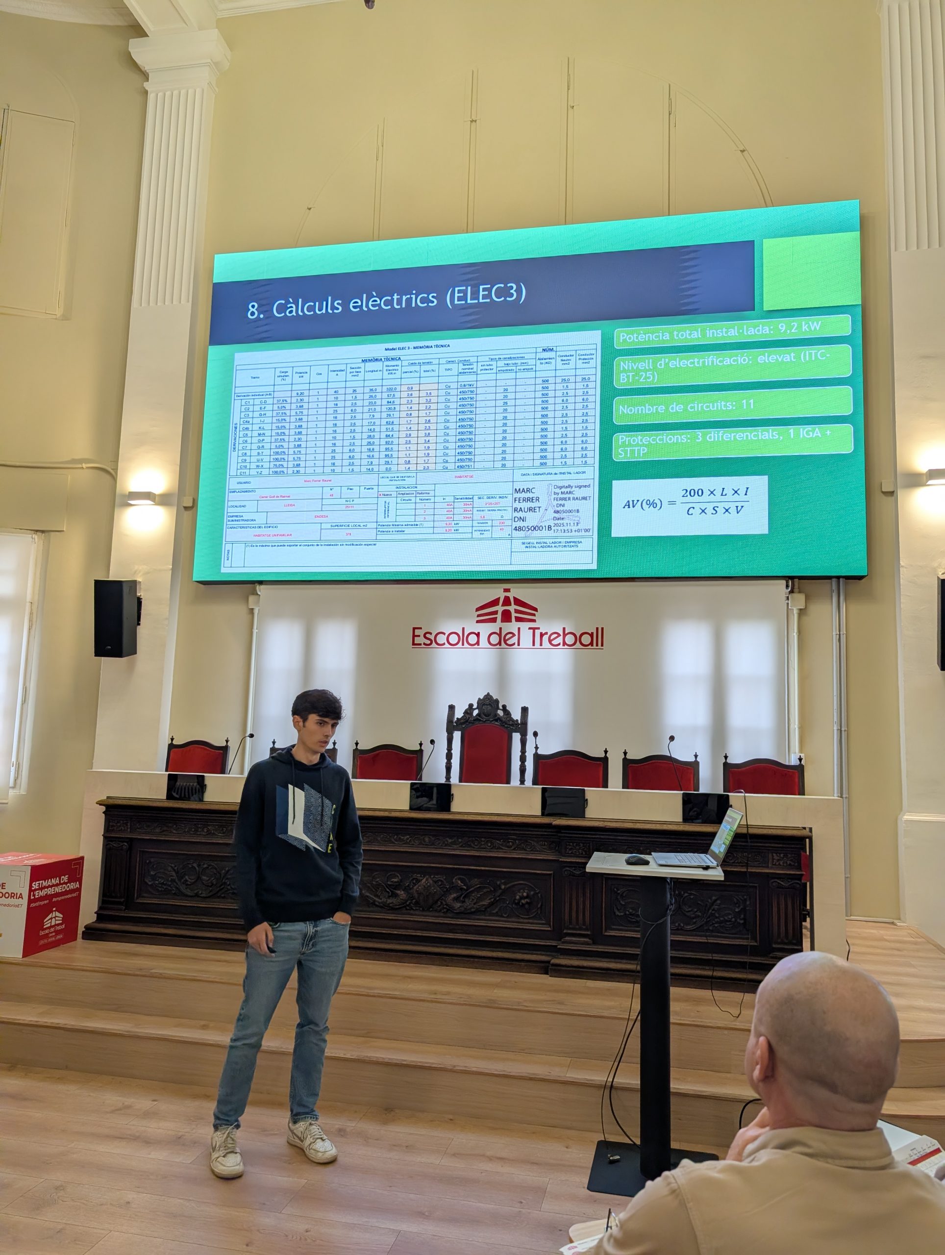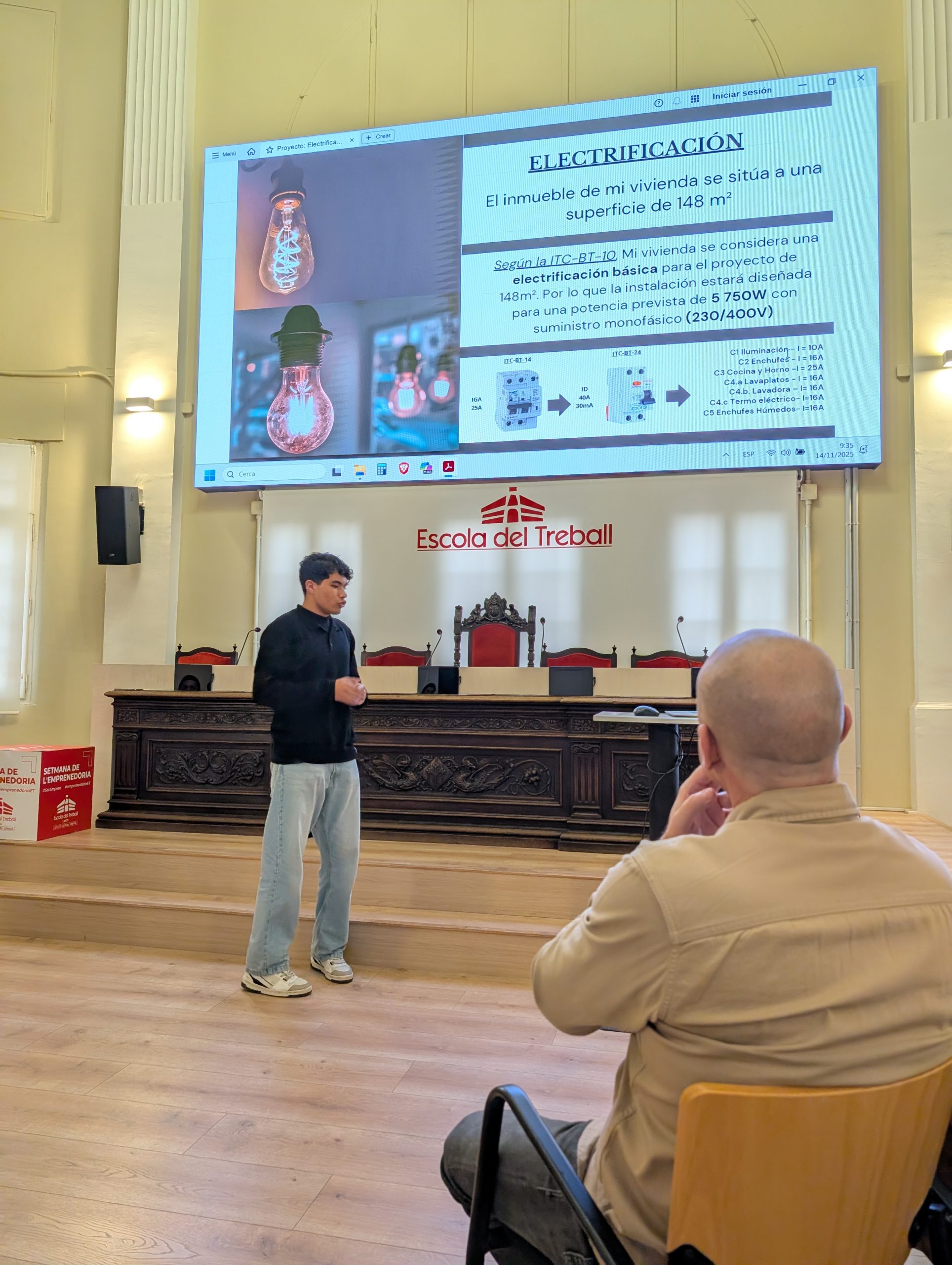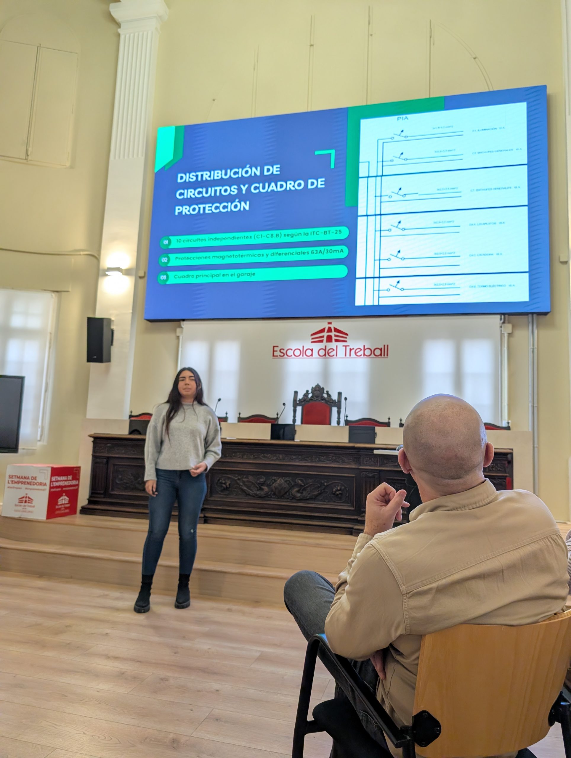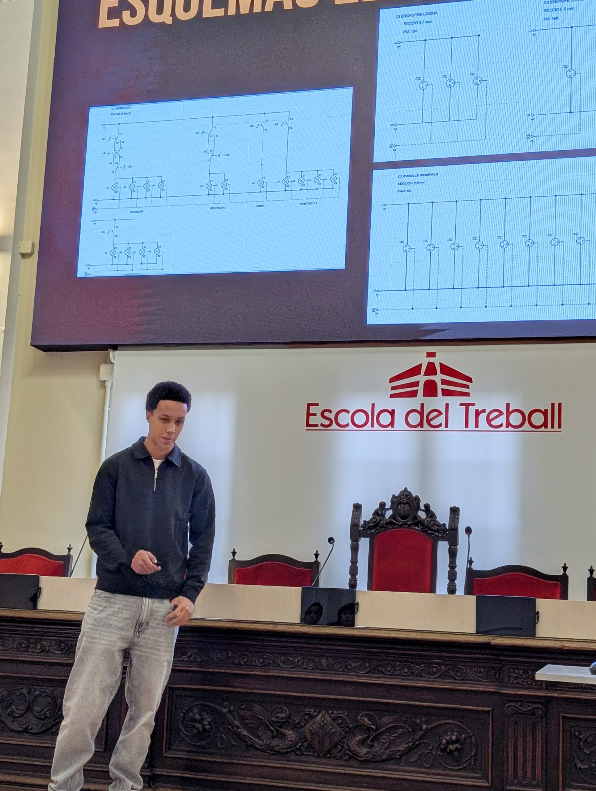 L’alumnat de primer curs del cicle formatiu de grau superior d’Energies Renovables de l’Escola del Treball de Lleida ha presentat recentment el Projecte 1: Electrificació d’un habitatge, en un acte celebrat a la històrica Sala d’Actes del centre. L’esdeveniment ha comptat amb l’assistència de l’equip docent del cicle i amb la presència destacada de professionals referents del sector elèctric, que han valorat i orientat els projectes des de la seva experiència.
