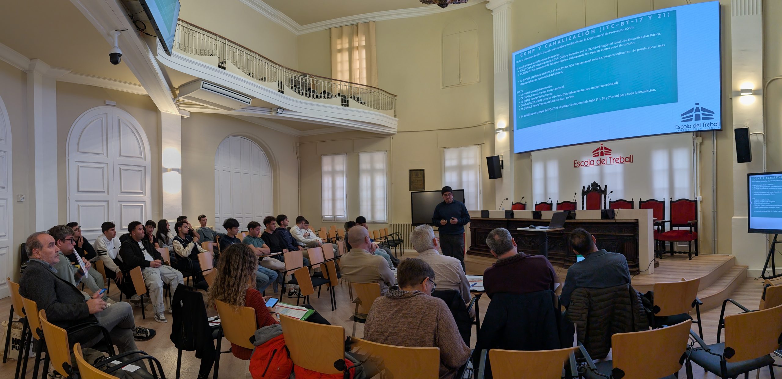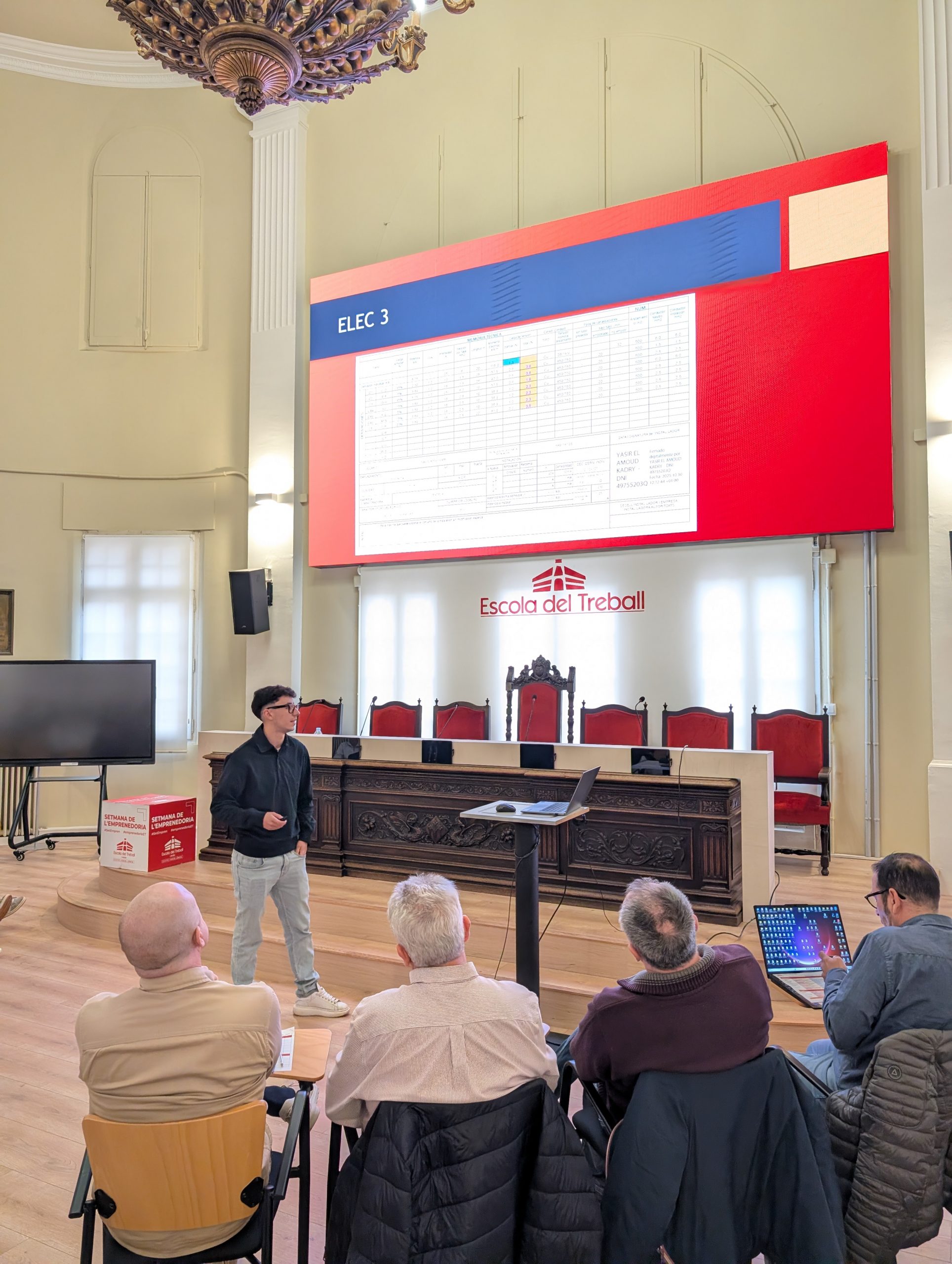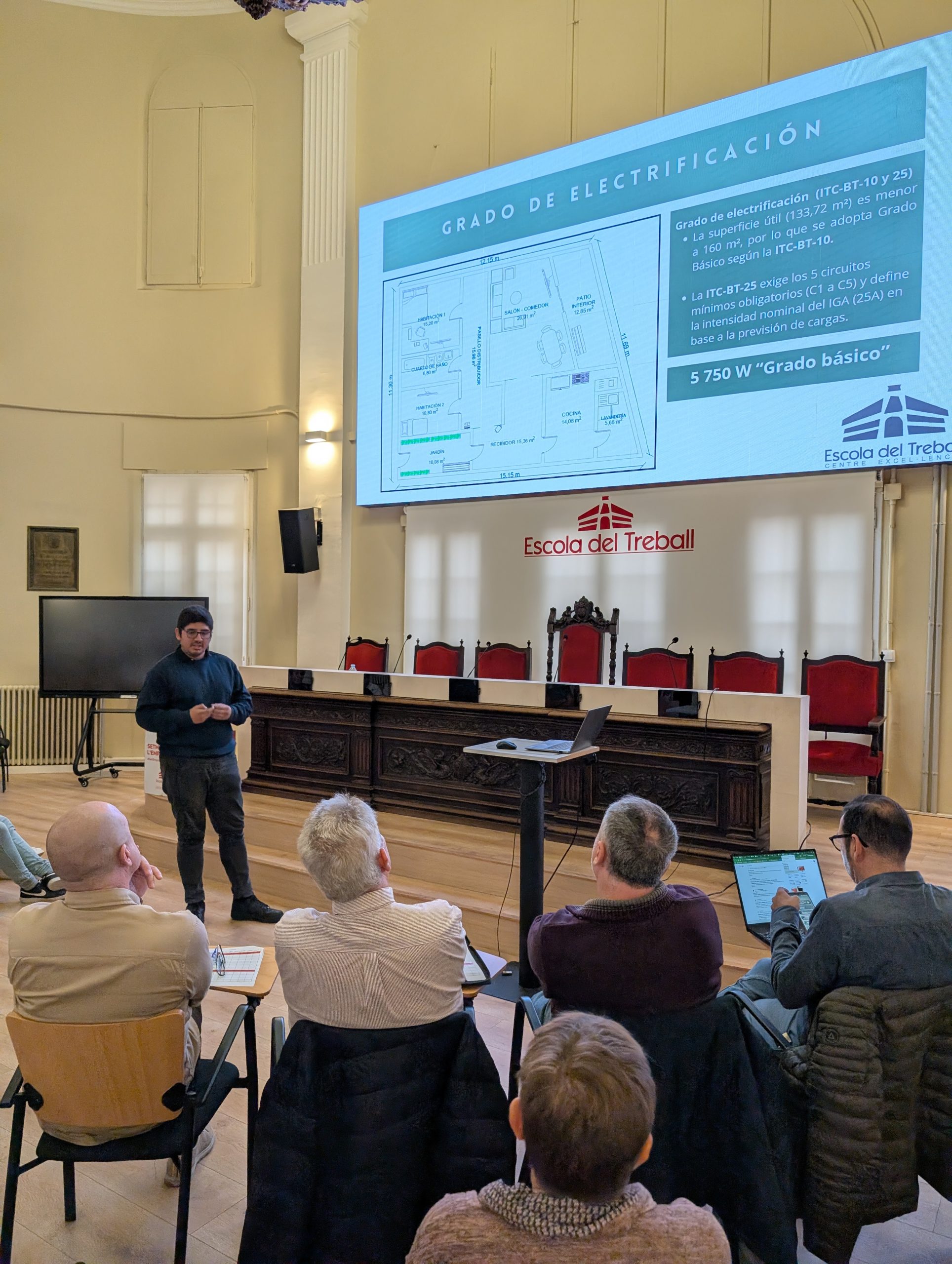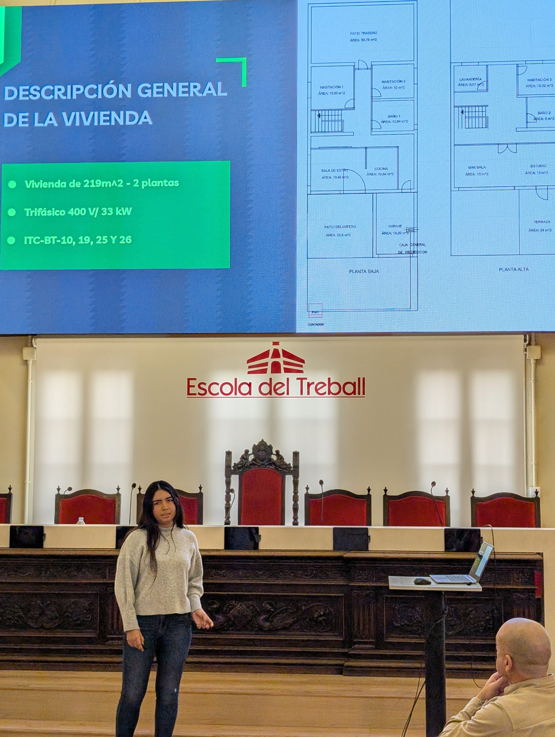 L’alumnat de primer curs del cicle formatiu de grau superior d’Energies Renovables de l’Escola del Treball de Lleida ha presentat recentment el Projecte 1: Electrificació d’un habitatge, en un acte celebrat a la històrica Sala d’Actes del centre. L’esdeveniment ha comptat amb l’assistència de l’equip docent del cicle i amb la presència destacada de professionals referents del sector elèctric, que han valorat i orientat els projectes des de la seva experiència.