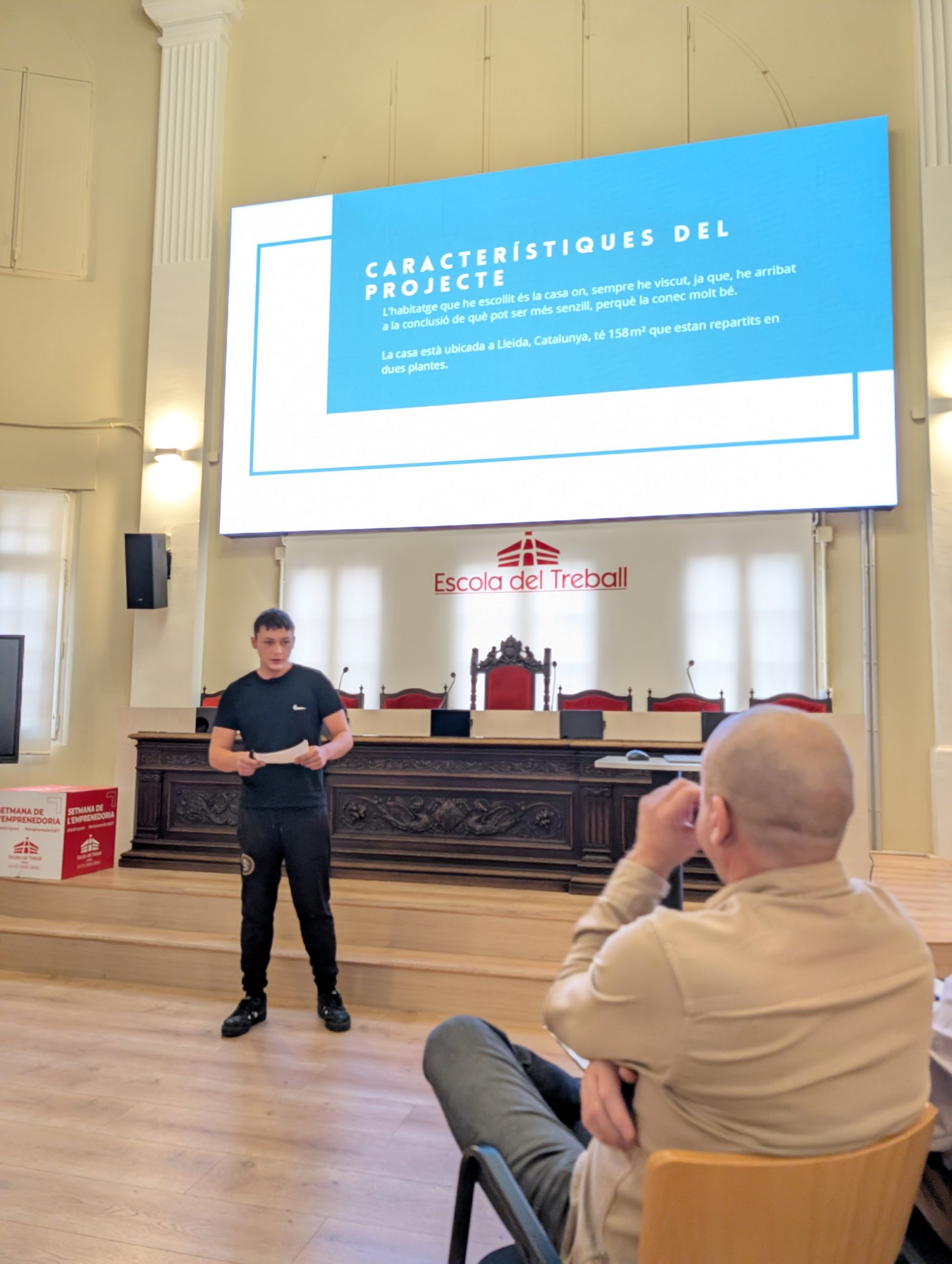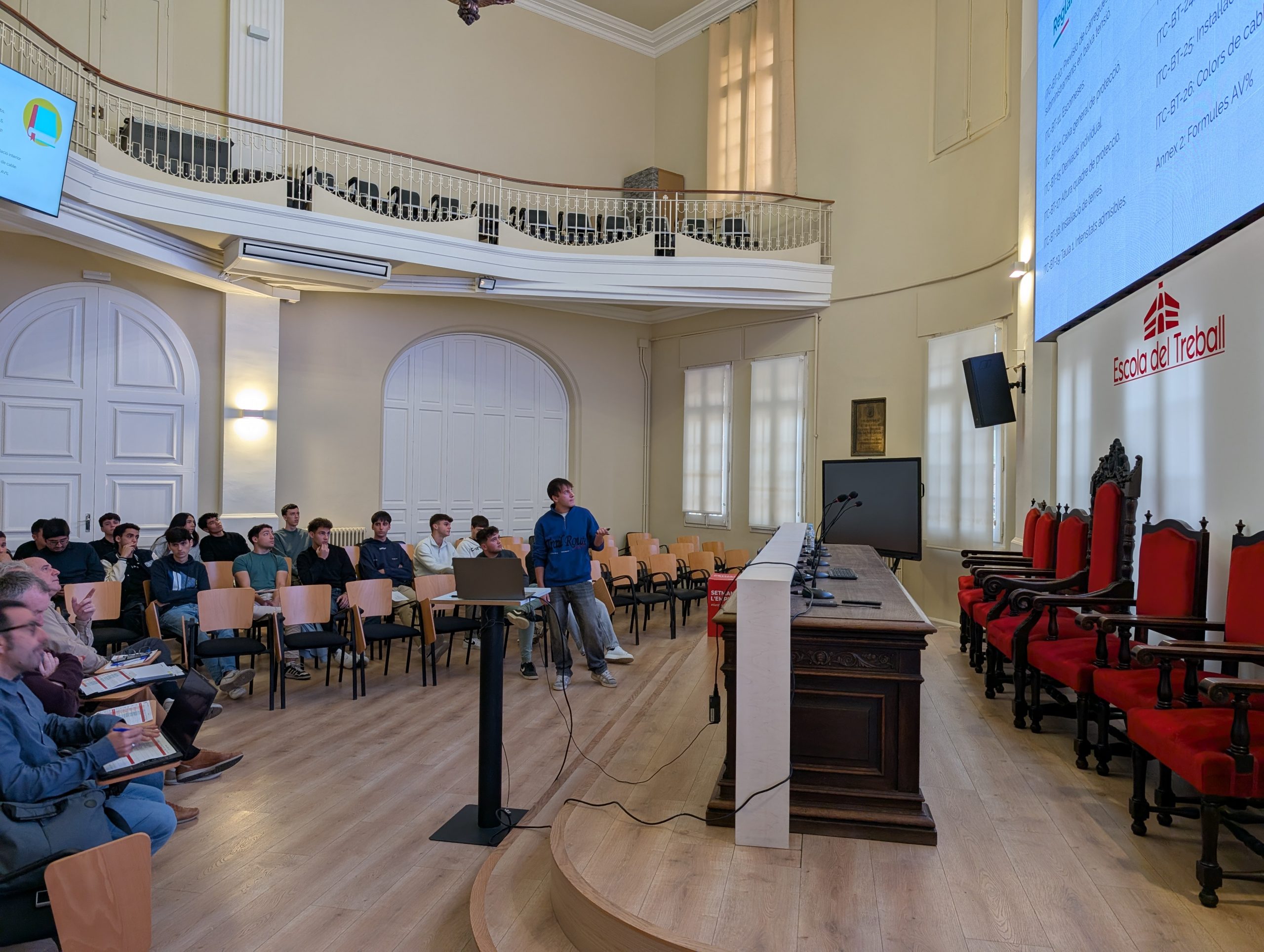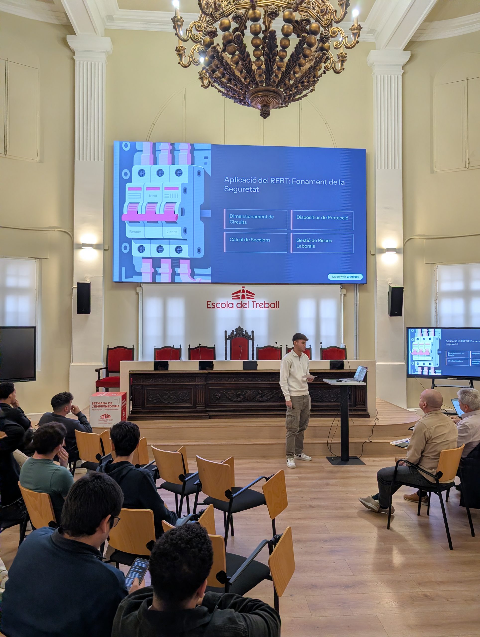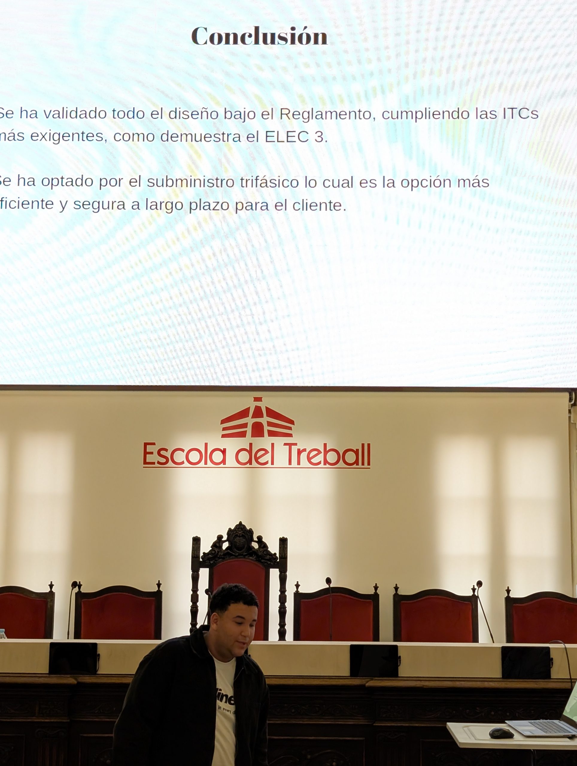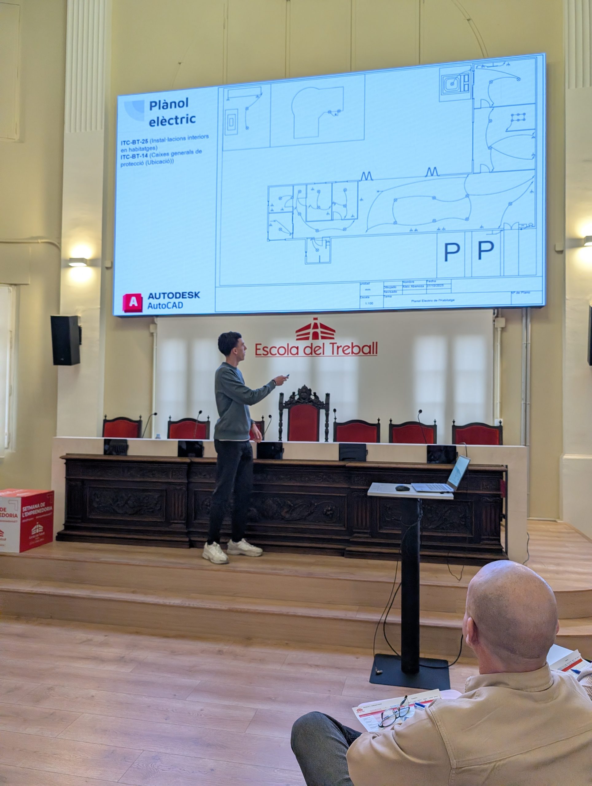L’alumnat de primer curs del cicle formatiu de grau superior d’Energies Renovables de l’Escola del Treball de Lleida ha presentat recentment el Projecte 1: Electrificació d’un habitatge, en un acte celebrat a la històrica Sala d’Actes del centre. L’esdeveniment ha comptat amb l’assistència de l’equip docent del cicle i amb la presència destacada de professionals referents del sector elèctric, que han valorat i orientat els projectes des de la seva experiència.