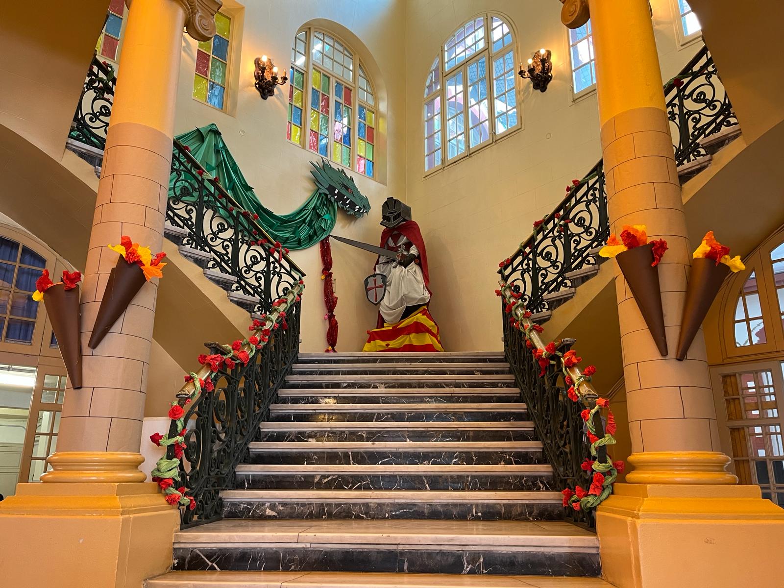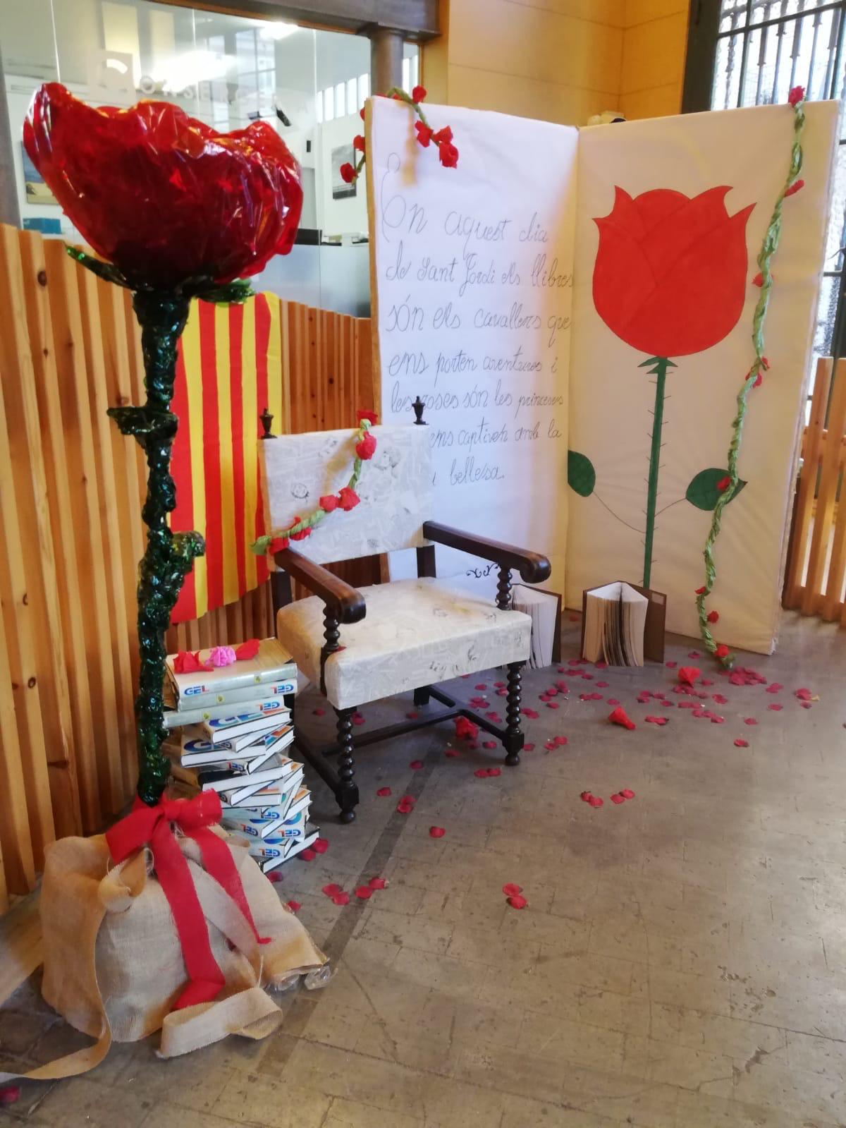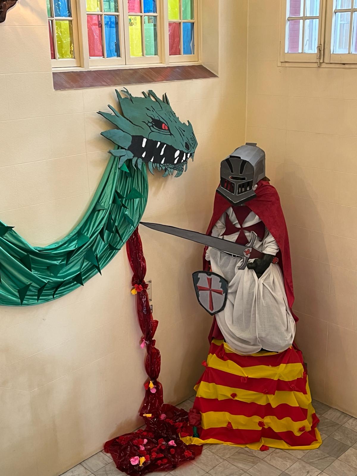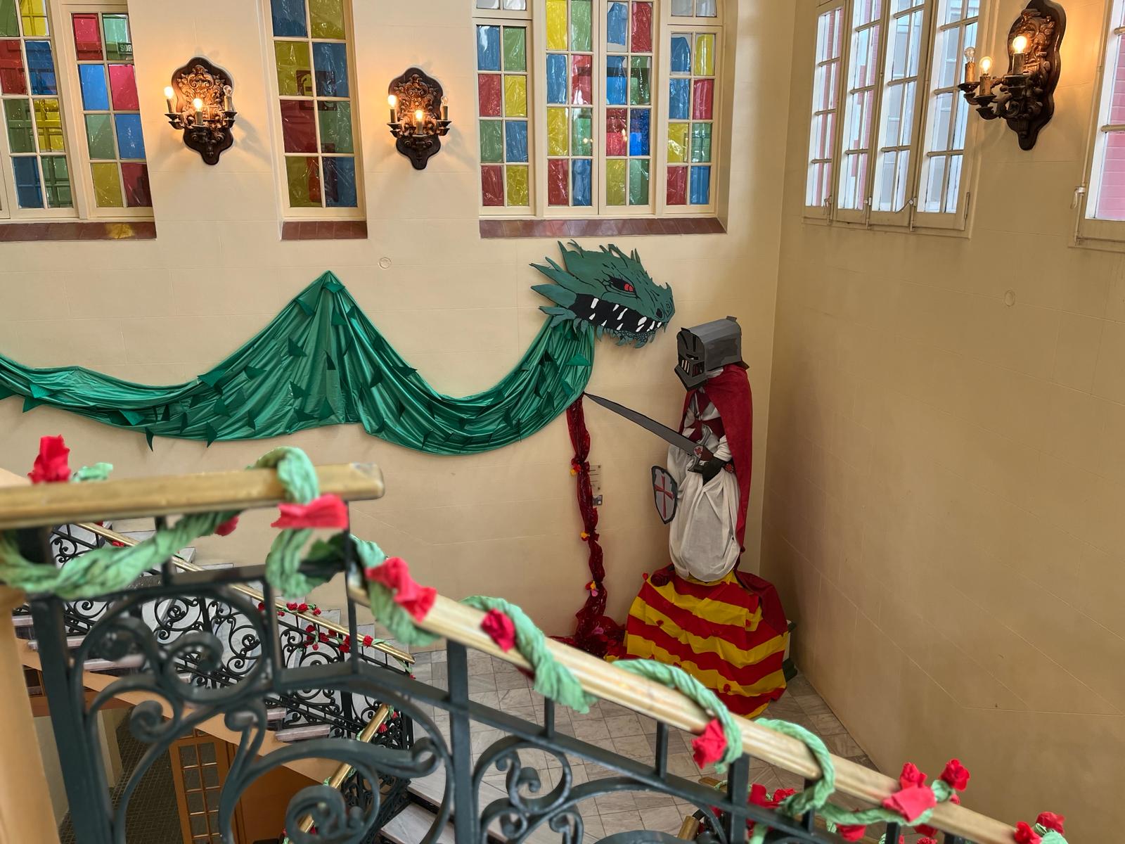 La decoració temàtica va incloure elements clàssics de la llegenda de Sant Jordi, amb un drac imponent, una princesa amb un vestit elaborat amb paper artesanal fet pel mateix alumnat, i Sant Jordi triomfant sobre el drac. Les roses i els llibres, símbols emblemàtics d’aquesta festivitat, també van estar presents en l’ambient creat per l’alumnat.