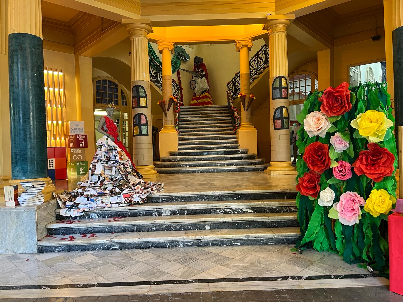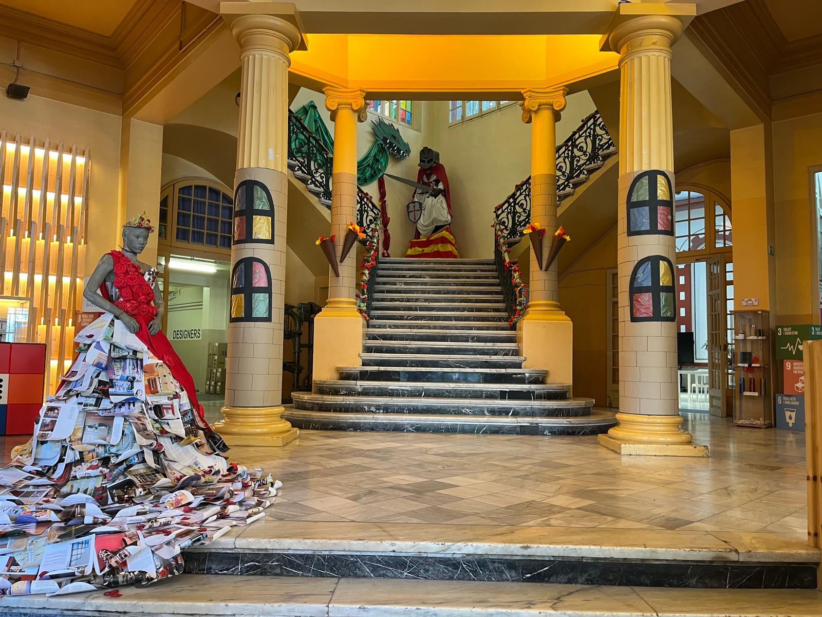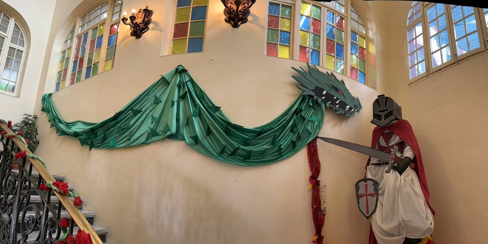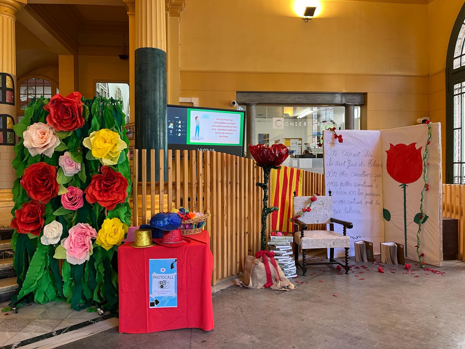 La decoració temàtica va incloure elements clàssics de la llegenda de Sant Jordi, amb un drac imponent, una princesa amb un vestit elaborat amb paper artesanal fet pel mateix alumnat, i Sant Jordi triomfant sobre el drac. Les roses i els llibres, símbols emblemàtics d’aquesta festivitat, també van estar presents en l’ambient creat per l’alumnat.