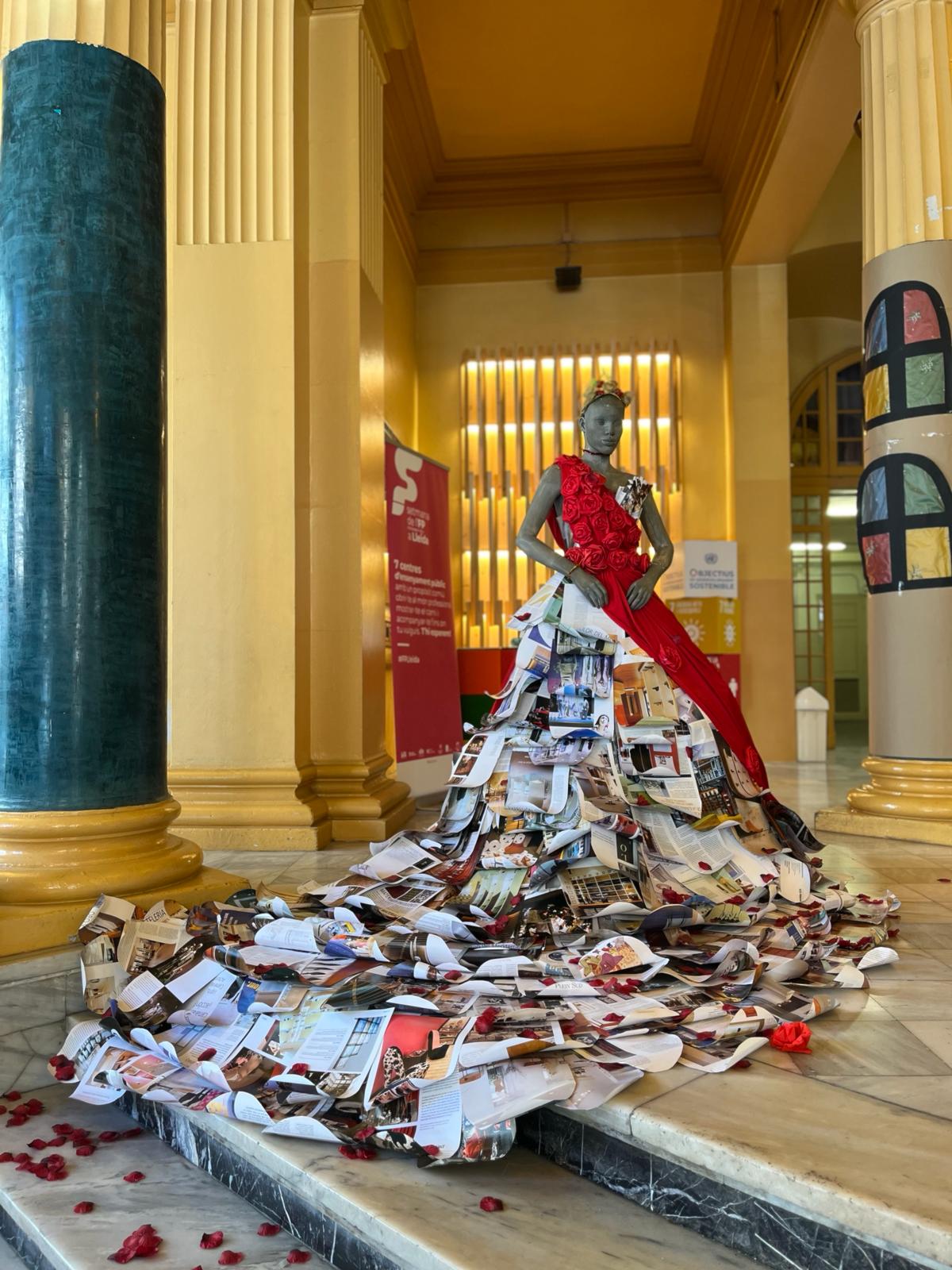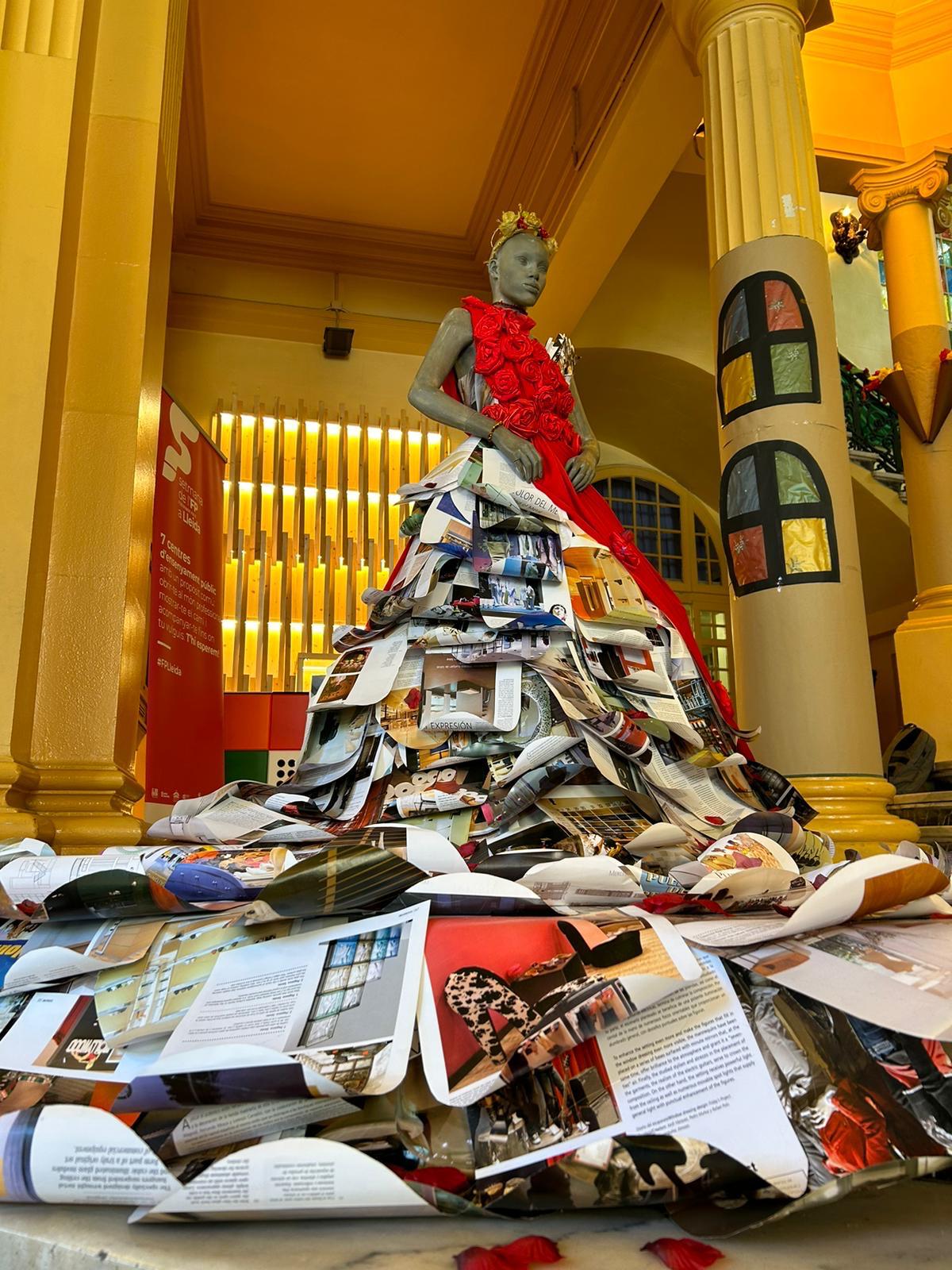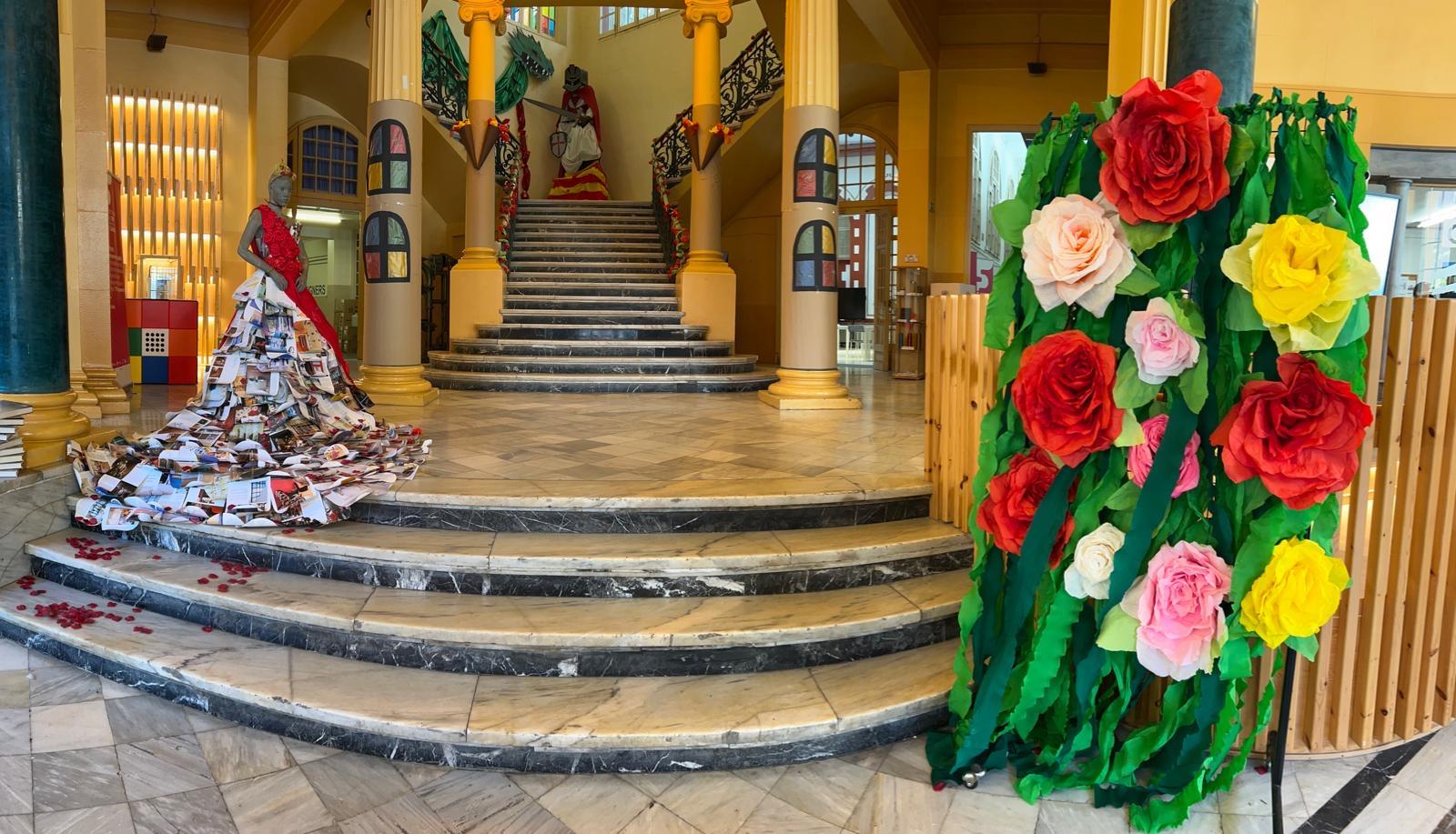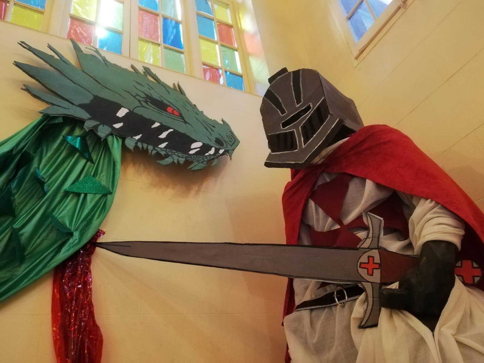 La decoració temàtica va incloure elements clàssics de la llegenda de Sant Jordi, amb un drac imponent, una princesa amb un vestit elaborat amb paper artesanal fet pel mateix alumnat, i Sant Jordi triomfant sobre el drac. Les roses i els llibres, símbols emblemàtics d’aquesta festivitat, també van estar presents en l’ambient creat per l’alumnat.