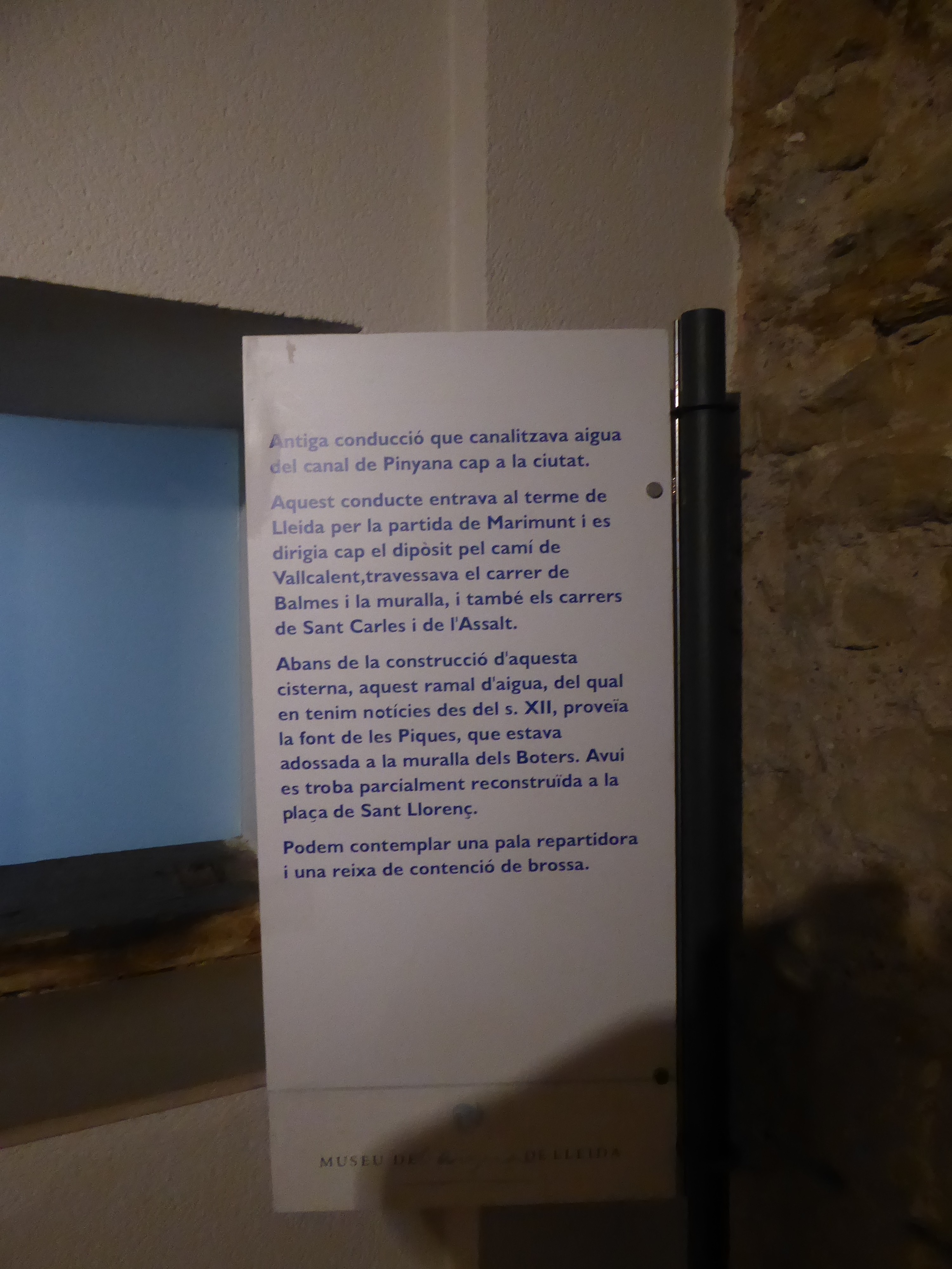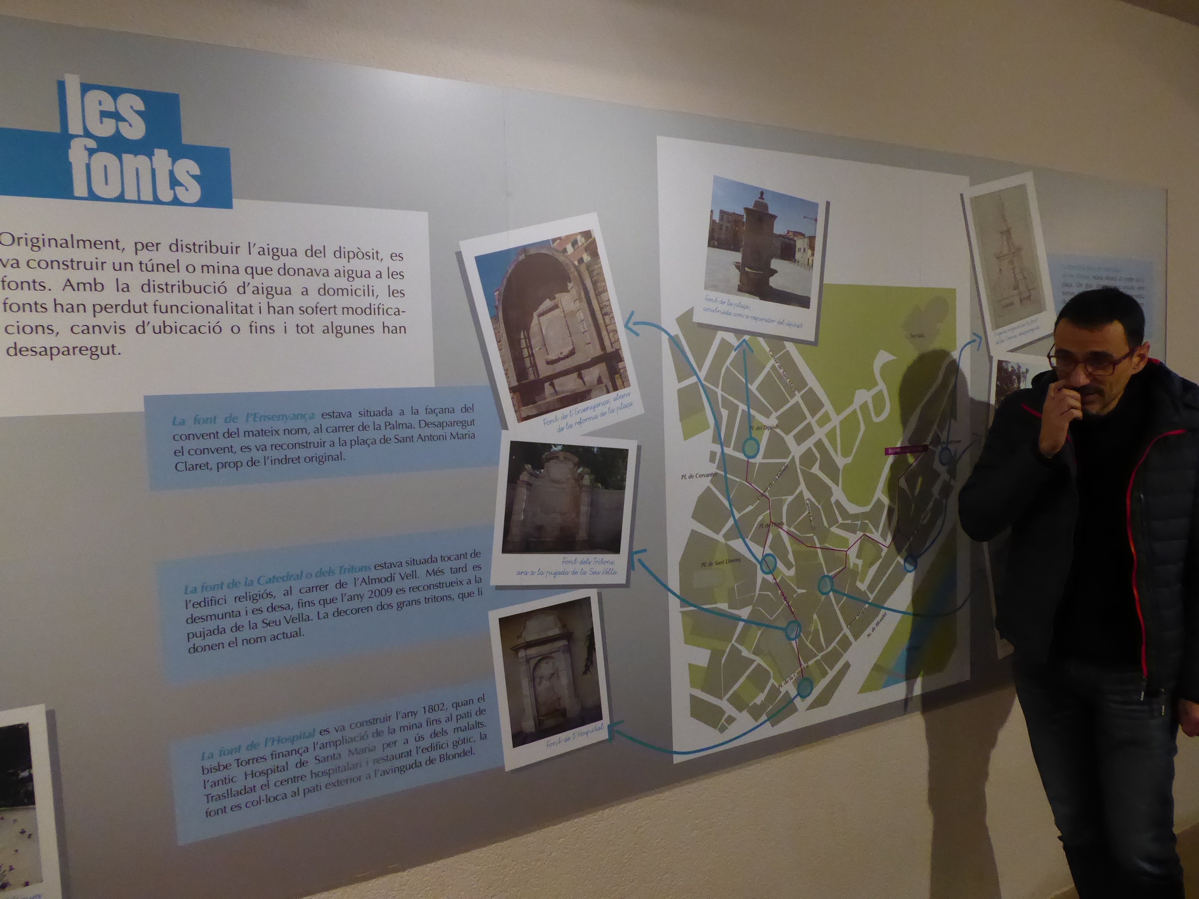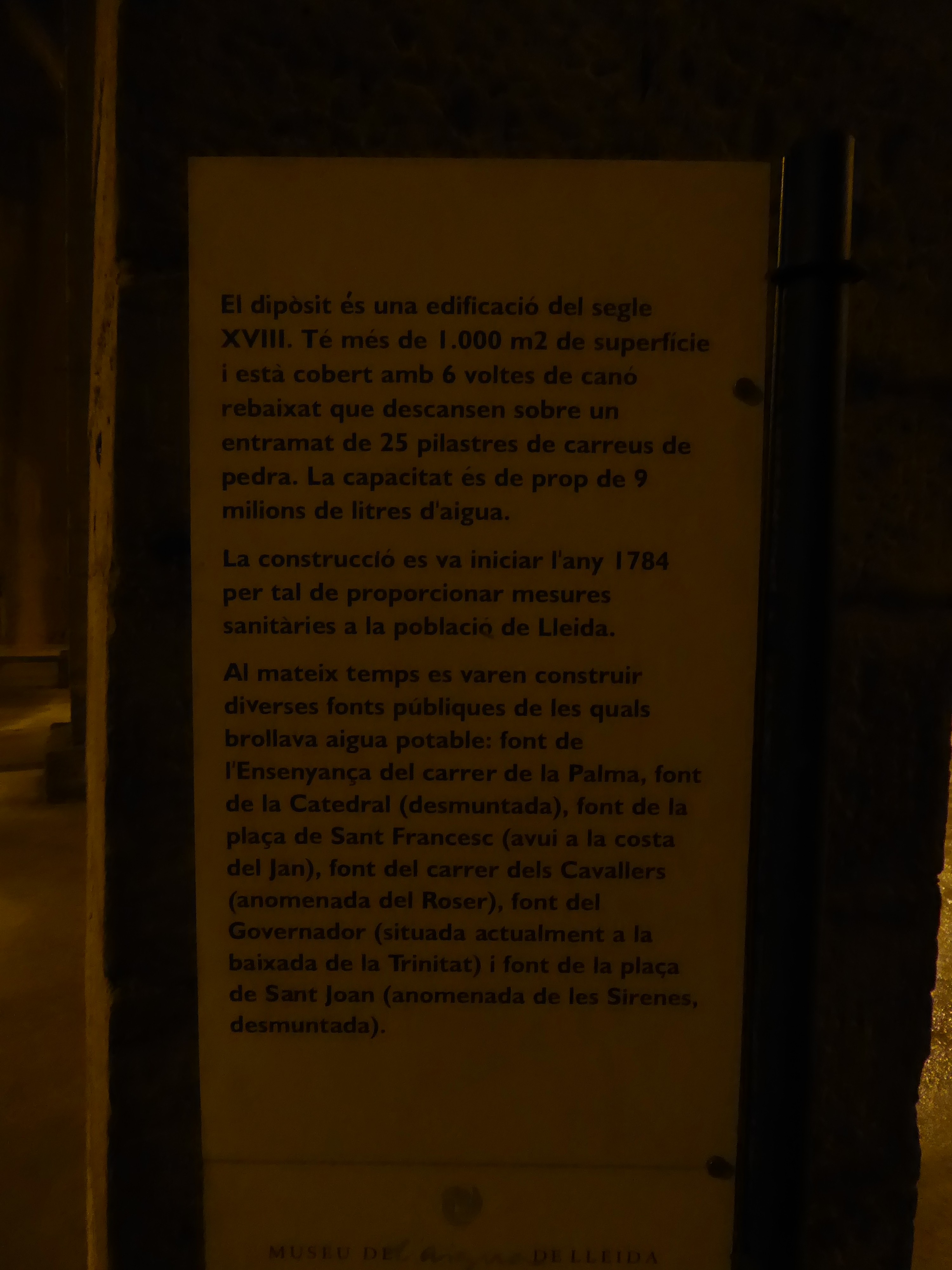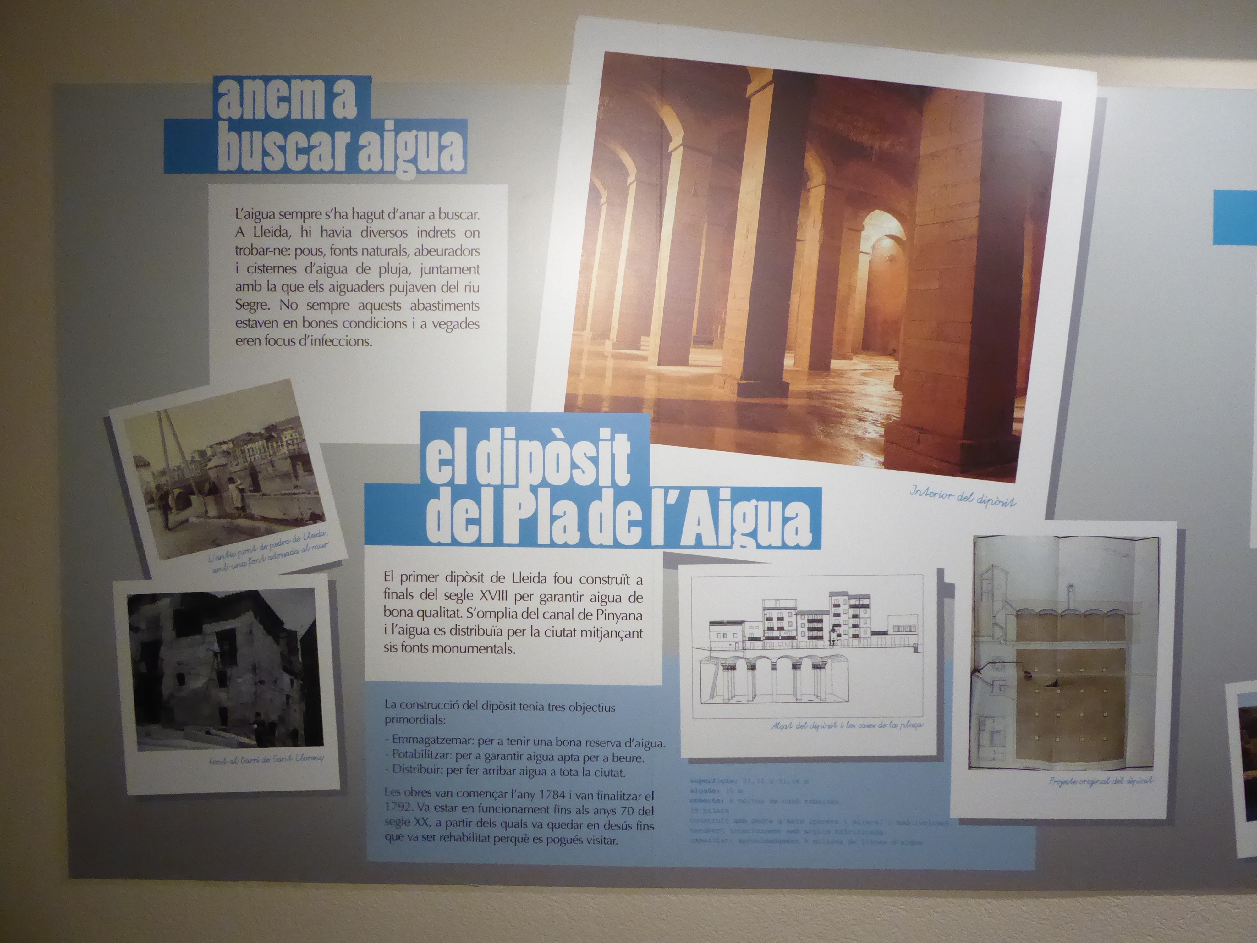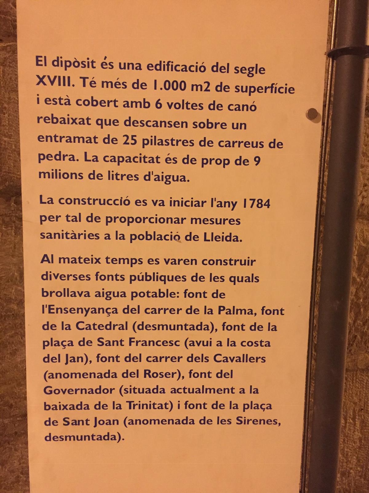 Per sota de la plaça del dipòsit, a prop del Mercat del Pla, en el centre històric de Lleida, s’hi troba l’antic dipòsit d’aigua, gran reservori que abastia la ciutat d’aigua potable, que va quedar en desús l’any 1974, i que fou finalment buidat l’any 1996. L’obra, que allotja 25 pilars i té capacitat per a nou milions de litres d’aigua, va ser iniciada el 1784 i es va concloure el 1792. La visita, programada dins el projecte d’anàlisi química i microbiològica d’aigües del nostre entorn, ha permès als alumnes acostar-se a uns equipaments que foren indispensables, en el seu temps, pel bon funcionament de la xarxa de distribució de l’aigua potable, però que també constitueixen, avui en dia, un bé cultural d’interès nacional, formant part del patrimoni històrico-cultural de la ciutat de Lleida.